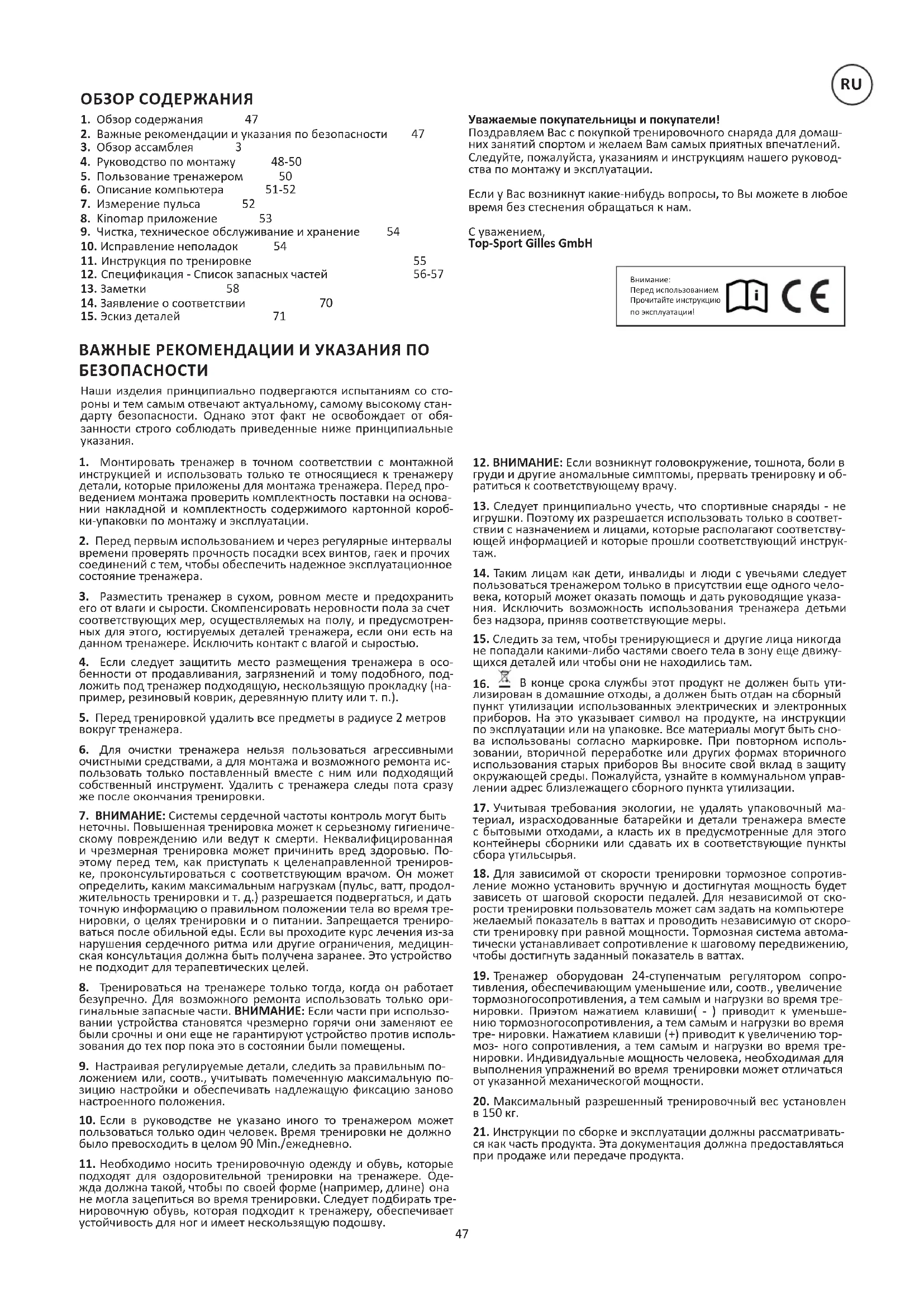 ОБЗОР СОДЕРЖАНИЯ Уважаемые покупательницы и покупатели! Поздравляем Вас с покупкой тренировочного снаряда для домаш- них занятий спортом и желаем Вам самых приятных впечатлений. Следуйте, пожалуйста, указаниям и инструкциям нашего руковод- ства по монтажу и эксплуатации. Если у Вас возникнут какие-нибудь вопросы, то Вы можете в любое время без стеснения обращаться к нам. С уважением, Top-Sport Gilles GmbH