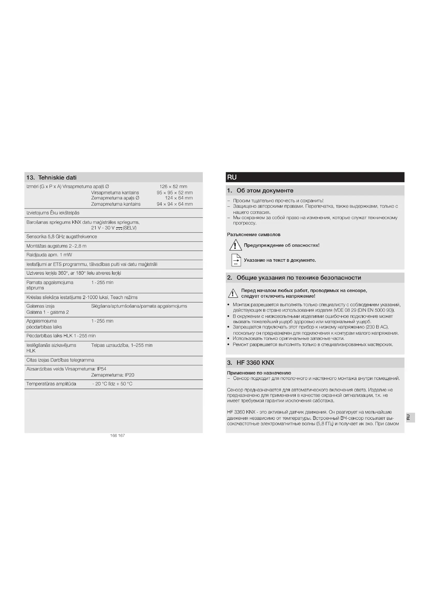 - Ремонт разрешается выполнять только в специализированных мастерских. 3 HF 3360 KNX Применение по назначению – Сенсор подходит для потолочного и настенного монтажа внутри помещений. Сенсор предназначается для автоматического включения света. Изделие не предназначено для применения в качестве охранной сигнализации, т.к. не имеет требуемой гарантии исключения саботажа. HF3360KNX - это активный датчик движения. Он реагирует на мельчайшие движения независимо от температуры. Встроенный ВЧ-сенсор посылает вы- сокочастотные электромагнитные волны (5,8 ГГц) и получает их эхо. При самом