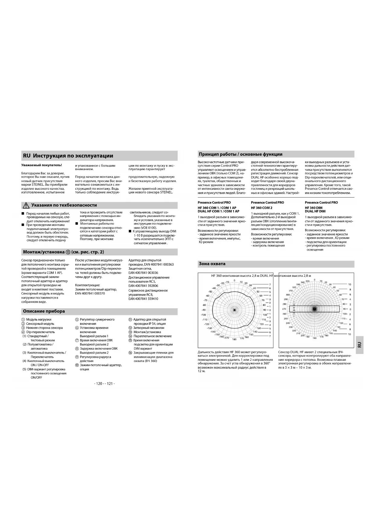 Перед началом монтажа дан- ного изделия, просим Вас вни- мательно ознакомиться с ин- струкцией по монтажу. Ведь только соблюдение инструк- ции по монтажу и пуску в экс- плуатацию гарантирует продолжительную, надежную и безотказную работу изделия. Желаем приятной эксплуата- ции нового сенсора STEINEL. Указания по техбезопасности Принцип работы / основные функции Высокочастотные датчики при- сутствия серии Control PRO управляют освещением и управ- лением ОВК (только COM 2), на- пример, в офисных помещени- ях, туалетах, общественных и частных зданиях в зависимости от интенсивности света окруже- ния и присутствия людей. Благо- даря современной высокоча- стотной технологии гарантиру- ется абсолютно беспроблемная регистрация движений. Сенсор DUAL HF особенно хорошо под- ходит благодаря своей двуна- правленности для коридоров гостиниц и рекреаций школь- ных и офисных зданий. Настрой- ки выходных разъемов и уста- новка дальности действия дат- чика присутствия выполняются посредством потенциометров и Dip-переключателей, или опци- онального дистанционного управления. Кроме того, такой Presence Control отличается сво- им низким токопотреблением. Presence Control PRO