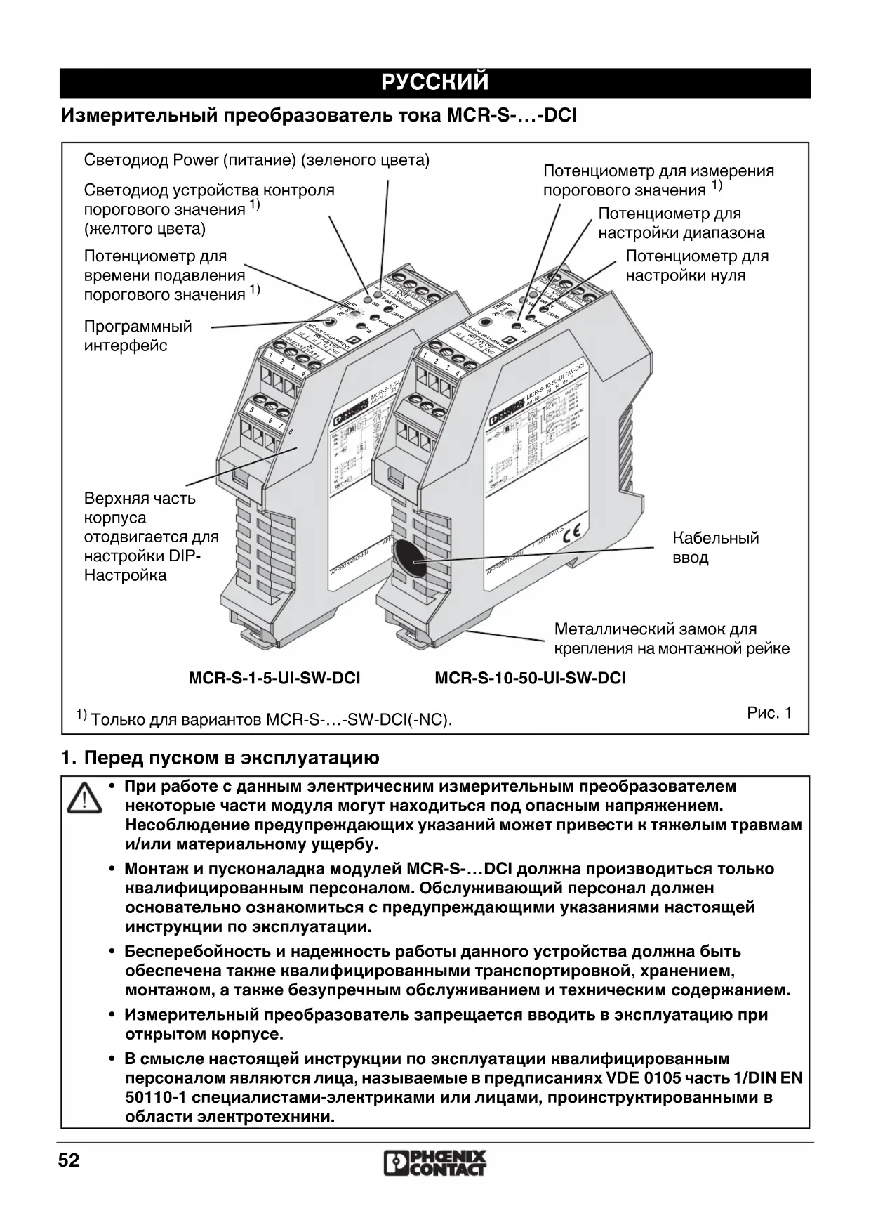 - Монтаж и пусконаладка модулей MCR-S-…DCI должна производиться только квалифицированным персоналом. Обслуживающий персонал должен основательно ознакомиться с предупреждающими указаниями настоящей инструкции по эксплуатации.