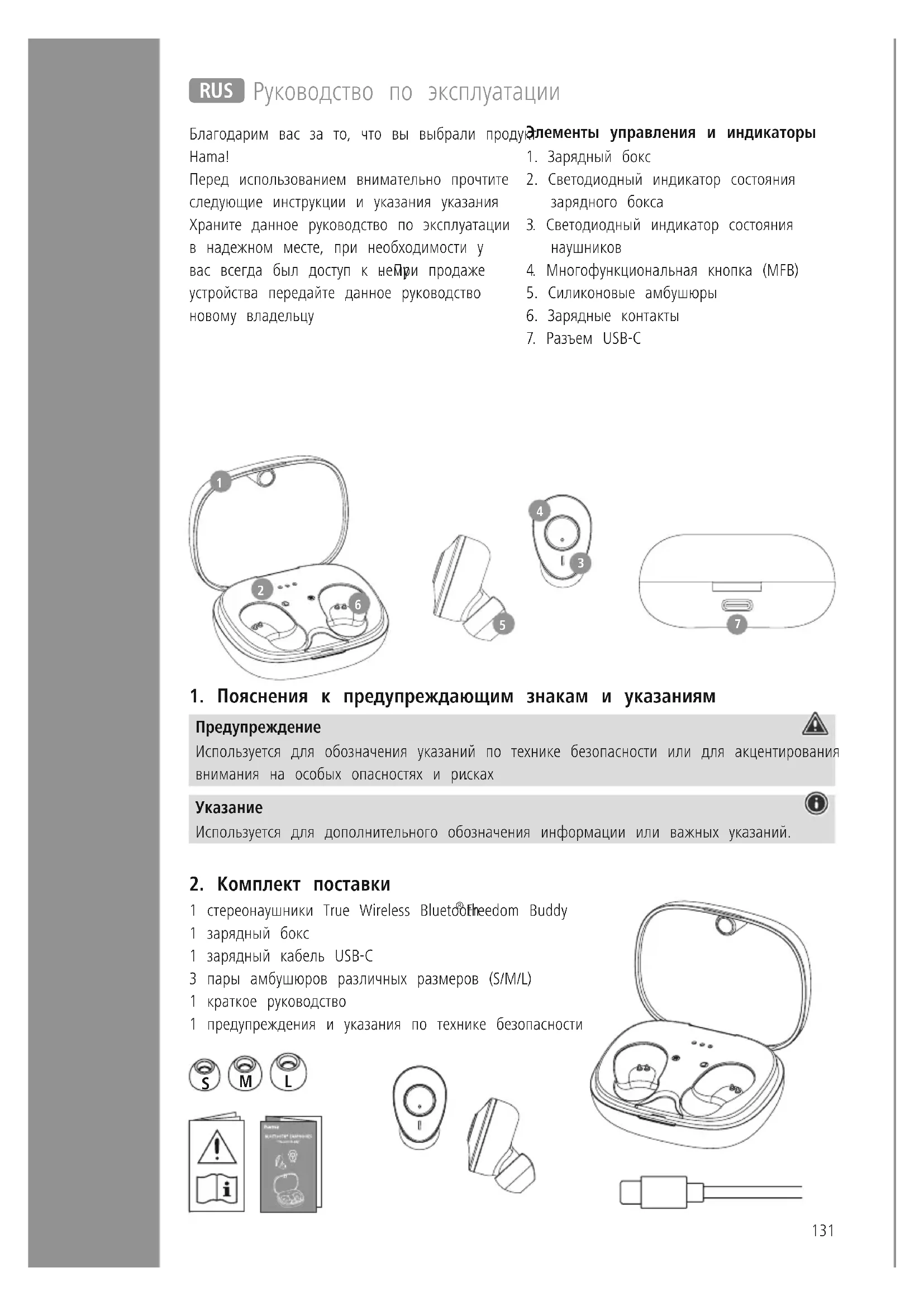 Freedom Buddy 1 зарядный бокс 1 зарядный кабель USB-C 3 пары амбушюров различных размеров (S/M/L) 1 краткое руководство 1 предупреждения и указания по технике безопасности