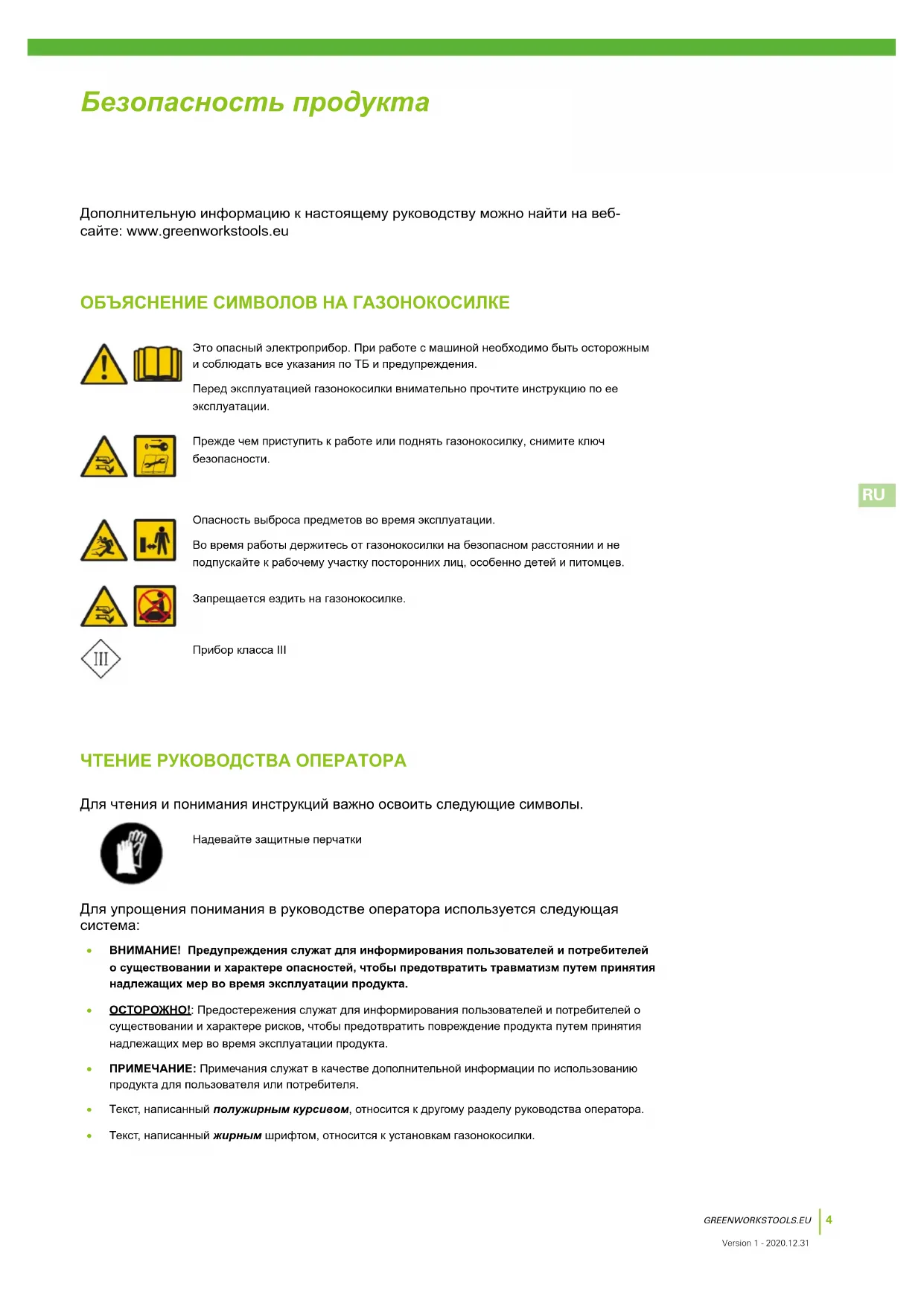 Version 1 - 2020.12.31 ОБЪЯСНЕНИЕ СИМВОЛОВ НА ГАЗОНОКОСИЛКЕ Это опасный электроприбор. При работе с машиной необходимо быть осторожным и соблюдать все указания по ТБ и предупреждения. Перед эксплуатацией газонокосилки внимательно прочтите инструкцию по ее эксплуатации. Прежде чем приступить к работе или поднять газонокосилку, снимите ключ безопасности. Опасность выброса предметов во время эксплуатации. Во время работы держитесь от газонокосилки на безопасном расстоянии и не подпускайте к рабочему участку посторонних лиц, особенно детей и питомцев. Запрещается ездить на газонокосилке. Прибор класса III Дополнительную информацию к настоящему руководству можно найти на веб- сайте: www.greenworkstools.eu ЧТЕНИЕ РУКОВОДСТВА ОПЕРАТОРА Для чтения и понимания инструкций важно освоить следующие символы. Надевайте защитные перчатки Для упрощения понимания в руководстве оператора используется следующая