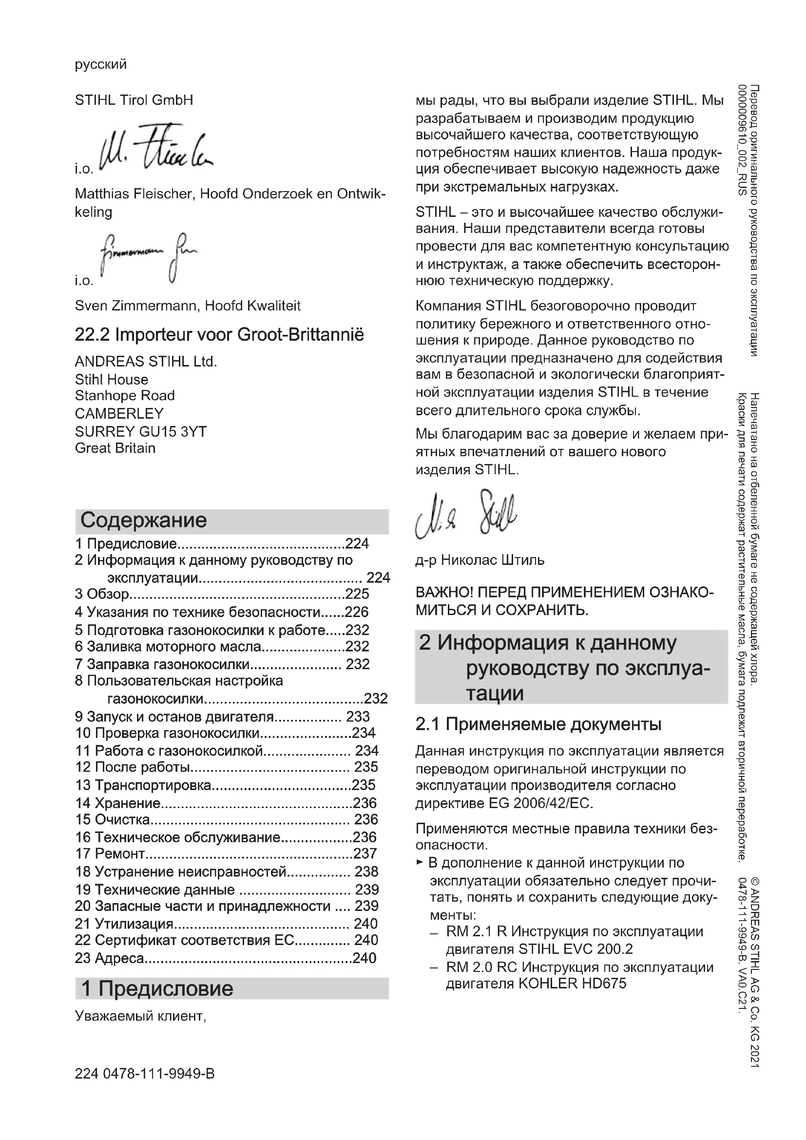 - 23 Адреса 1 Предисловие Уважаемый клиент, мы рады, что вы выбрали изделие STIHL. Мы разрабатываем и производим продукцию высочайшего качества, соответствующую потребностям наших клиентов. Наша продук‐ ция обеспечивает высокую надежность даже при экстремальных нагрузках. STIHL – это и высочайшее качество обслужи‐ вания. Наши представители всегда готовы провести для вас компетентную консультацию и инструктаж, а также обеспечить всесторон‐ нюю техническую поддержку. Компания STIHL безоговорочно проводит политику бережного и ответственного отно‐ шения к природе. Данное руководство по эксплуатации предназначено для содействия вам в безопасной и экологически благоприят‐ ной эксплуатации изделия STIHL в течение всего длительного срока службы. Мы благодарим вас за доверие и желаем при‐ ятных впечатлений от вашего нового изделия STIHL. д-р Николас Штиль ВАЖНО! ПЕРЕД ПРИМЕНЕНИЕМ ОЗНАКО‐ МИТЬСЯ И СОХРАНИТЬ. 2 Информация к данному руководству по эксплуа‐ p. 240