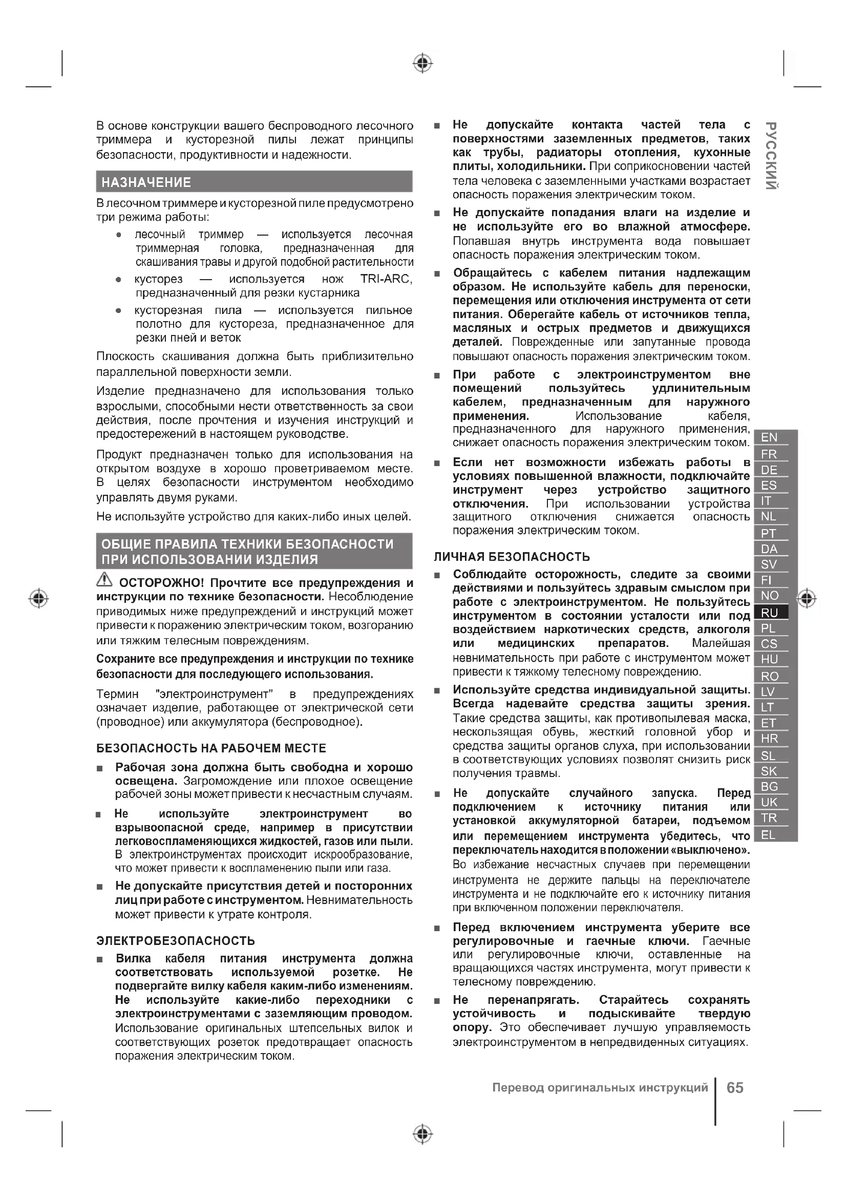 В лесочном триммере и кусторезной пиле предусмотрено три режима работы: ● лесочный триммер — используется лесочная триммерная головка, предназначенная для скашивания травы и другой подобной растительности ● кусторез — используется нож TRI-ARC, предназначенный для резки кустарника ● кусторезная пила — используется пильное полотно для кустореза, предназначенное для резки пней и веток Плоскость скашивания должна быть приблизительно параллельной поверхности земли. Изделие предназначено для использования только взрослыми, способными нести ответственность за свои действия, после прочтения и изучения инструкций и предостережений в настоящем руководстве. Продукт предназначен только для использования на открытом воздухе в хорошо проветриваемом месте. В целях безопасности инструментом необходимо управлять двумя руками. Не используйте устройство для каких-либо иных целей. ОБЩИЕ ПРАВИЛА ТЕХНИКИ БЕЗОПАСНОСТИ ПРИ ИСПОЛЬЗОВАНИИ ИЗДЕЛИЯ ОСТОРОЖНО! Прочтите все предупреждения и инструкции по технике безопасности. Несоблюдение приводимых ниже предупреждений и инструкций может привести к поражению электрическим током, возгоранию или тяжким телесным повреждениям. Сохраните все предупреждения и инструкции по технике безопасности для последующего использования. Термин "электроинструмент" в предупреждениях означает изделие, работающее от электрической сети (проводное) или аккумулятора (беспроводное). БЕЗОПАСНОСТЬ НА РАБОЧЕМ МЕСТЕ ■ Рабочая зона должна быть свободна и хорошо освещена. Загромождение или плохое освещение рабочей зоны может привести к несчастным случаям. ■ Не используйте электроинструмент во взрывоопасной среде, например в присутствии легковоспламеняющихся жидкостей, газов или пыли. В электроинструментах происходит искрообразование, что может привести к воспламенению пыли или газа. ■ Не допускайте присутствия детей и посторонних лиц при работе с инструментом. Невнимательность может привести к утрате контроля. ЭЛЕКТРОБЕЗОПАСНОСТЬ ■ Вилка кабеля питания инструмента должна соответствовать используемой розетке. Не подвергайте вилку кабеля каким-либо изменениям. Не используйте какие-либо переходники с электроинструментами с заземляющим проводом. Использование оригинальных штепсельных вилок и соответствующих розеток предотвращает опасность поражения электрическим током. ■ Не допускайте контакта частей тела с поверхностями заземленных предметов, таких как трубы, радиаторы отопления, кухонные плиты, холодильники. При соприкосновении частей тела человека с заземленными участками возрастает опасность поражения электрическим током. ■ Не допускайте попадания влаги на изделие и не используйте его во влажной атмосфере. Попавшая внутрь инструмента вода повышает опасность поражения электрическим током. ■ Обращайтесь с кабелем питания надлежащим образом. Не используйте кабель для переноски, перемещения или отключения инструмента от сети питания. Оберегайте кабель от источников тепла, масляных и острых предметов и движущихся деталей. Поврежденные или запутанные провода повышают опасность поражения электрическим током. ■ При работе с электроинструментом вне помещений пользуйтесь удлинительным кабелем, предназначенным для наружного применения. Использование кабеля, предназначенного для на