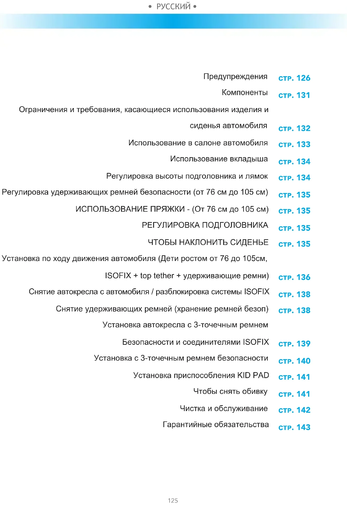 Ограничения и требования, касающиеся использования изделия и сиденья автомобиля Использование в салоне автомобиля Использование вкладыша Регулировка высоты подголовника и лямок Регулировка удерживающих ремней безопасности (от 76 см до 105 см) ИСПОЛЬЗОВАНИЕ ПРЯЖКИ - (От 76 см до 105 см) РЕГУЛИРОВКА ПОДГОЛОВНИКА ЧТОБЫ НАКЛОНИТЬ СИДЕНЬЕ Установка по ходу движения автомобиля (Дети ростом от 76 до 105см, ISOFIX + top tether + удерживающие ремни) Снятие автокресла с автомобиля / разблокировка системы ISOFIX Снятие удерживающих ремней (хранение ремней безоп) Установка автокресла с 3-точечным ремнем Безопасности и соединителями ISOFIX Установка с 3-точечным ремнем безопасности Установка приспособления KID PAD Чтобы снять обивку Чистка и обслуживание Гарантийные обязательства• РУССКИЙ • • РУССКИЙ •