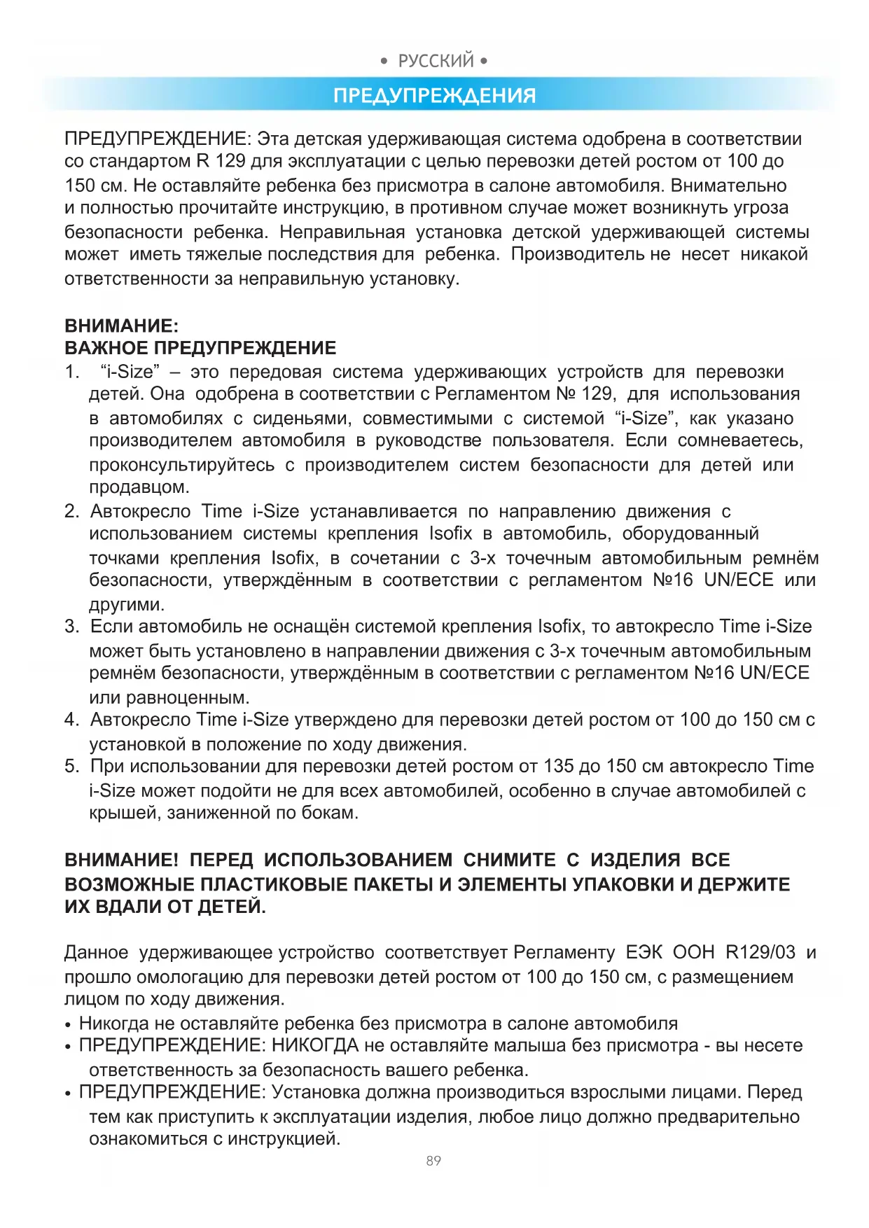 ПРЕДУПРЕЖДЕНИЕ: Эта детская удерживающая система одобрена в соответствии со стандартом R 129 для эксплуатации с целью перевозки детей ростом от 100 до 150 см. Не оставляйте ребенка без присмотра в салоне автомобиля. Внимательно и полностью прочитайте инструкцию, в противном случае может возникнуть угроза безопасности ребенка. Неправильная установка детской удерживающей системы может иметь тяжелые последствия для ребенка. Производитель не несет никакой ответственности за неправильную установку.
