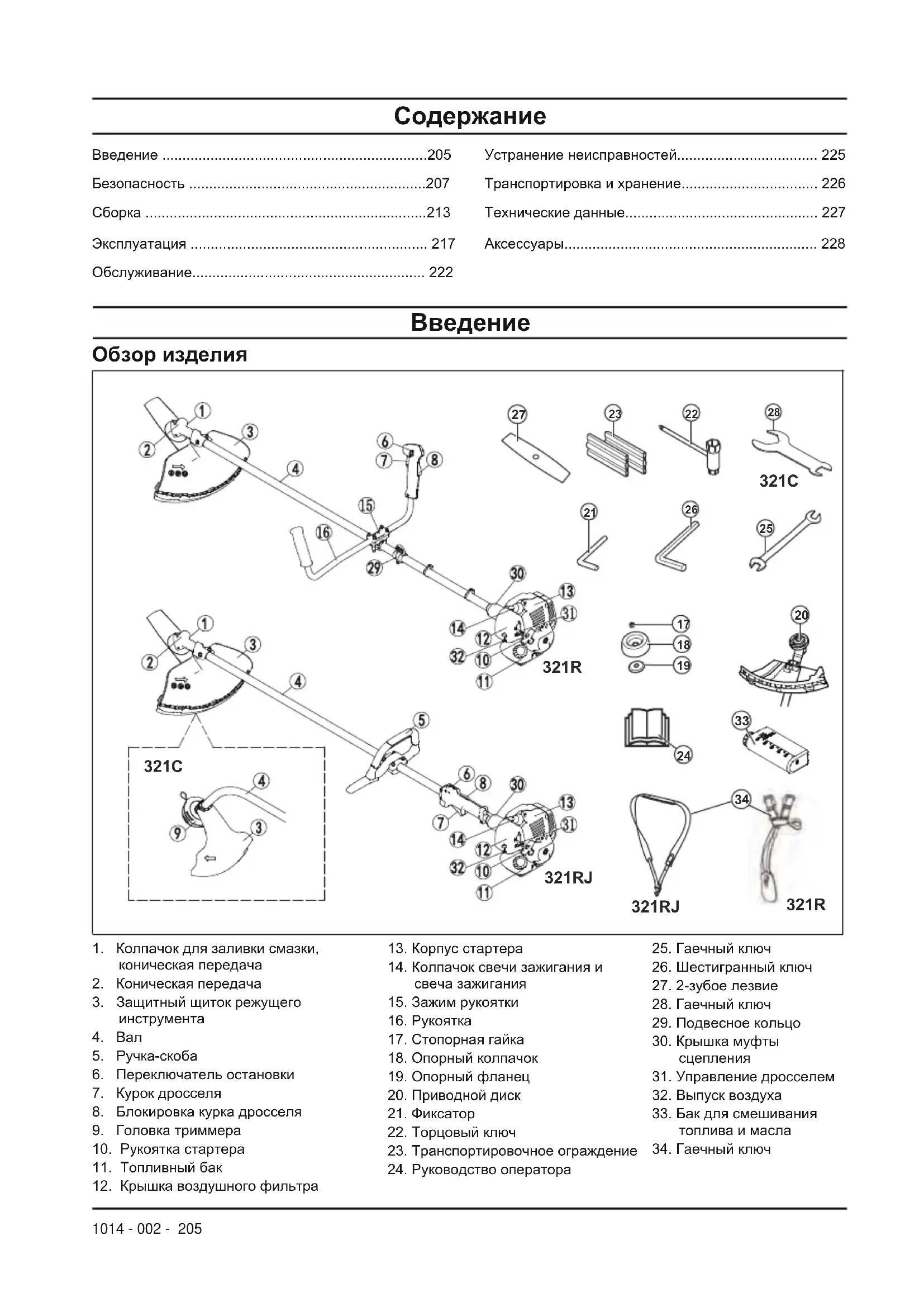 против часовой стрелки до остановки режущего инструмента.224 1014 - 002 - ВНИМАНИЕ: Не используйте бензин или масло, предназначенные для четырехтактных двигателей. ВНИМАНИЕ: Всегда используйте свечи зажигания рекомендованного типа. Неправильный тип свечи зажигания может привести к повреждению изделия. ВНИМАНИЕ: Всегда заменяйте поврежденный, очень грязный или пропитанный топливом воздушный фильтр. Топливный фильтр Для проверки свечи Для добавления смазки в коническую шестерню Для очистки воздушного фильтра