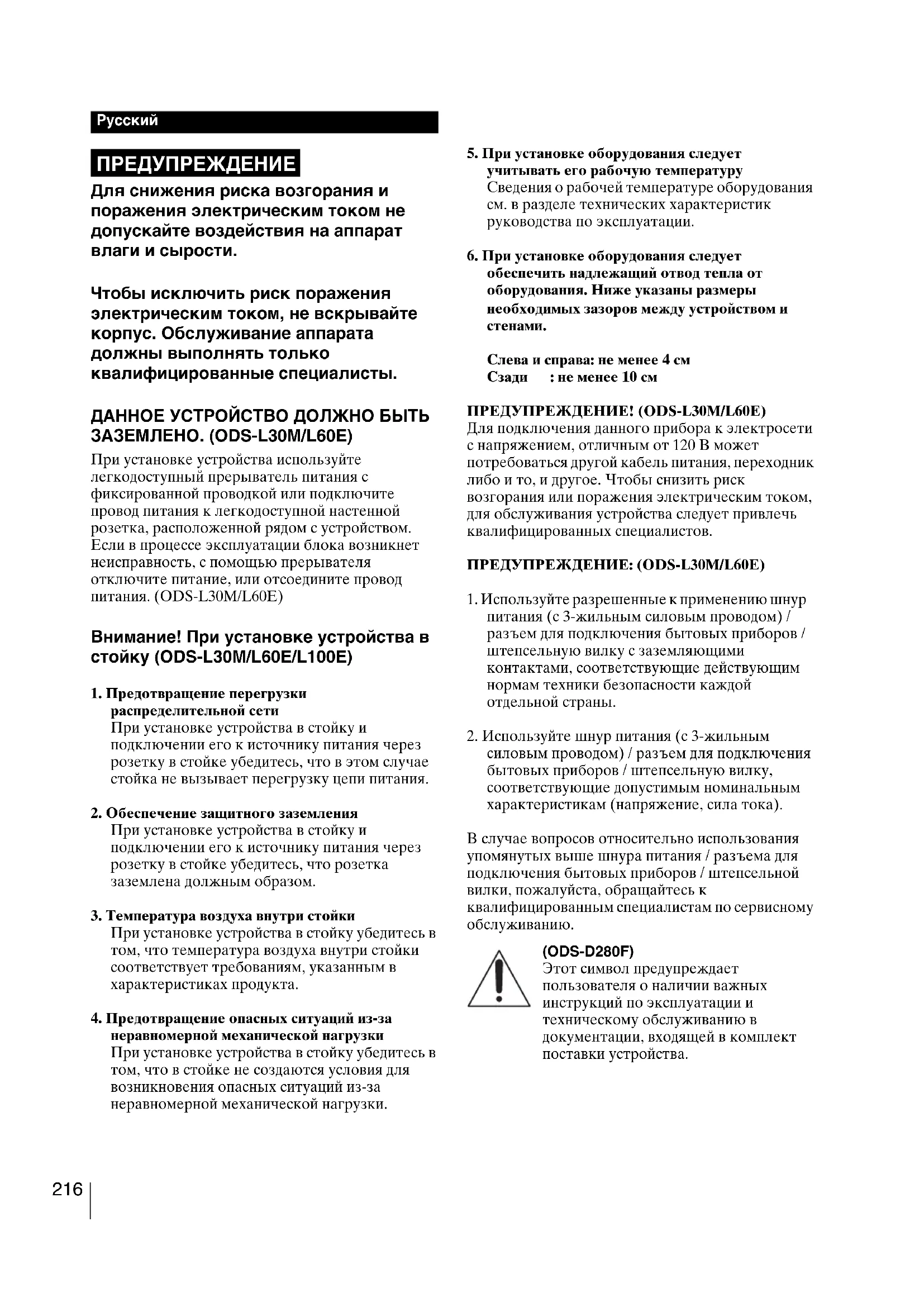 (PBDE) 实装基板 × ○ ○ ○ ○ ○ 外壳 × ○ ○ ○ ○ ○ 附属品 × ○ ○ ○ ○ ○216 Для снижения риска возгорания и поражения электрическим током не допускайте воздействия на аппарат влаги и сырости. Чтобы исключить риск поражения электрическим током, не вскрывайте корпус. Обслуживание аппарата должны выполнять только квалифицированные специалисты. ДАННОЕ УСТРОЙСТВО ДОЛЖНО БЫТЬ ЗАЗЕМЛЕНО. (ODS-L30M/L60E) При установке устройства используйте легкодоступный прерыватель питания с фиксированной проводкой или подключите провод питания к легкодоступной настенной розетка, расположенной рядом с устройством. Если в процессе эксплуатации блока возникнет неисправность, с помощью прерывателя отключите питание, или отсоедините провод питания. (ODS-L30M/L60E) Внимание! При установке устройства в стойку (ODS-L30M/L60E/L100E)