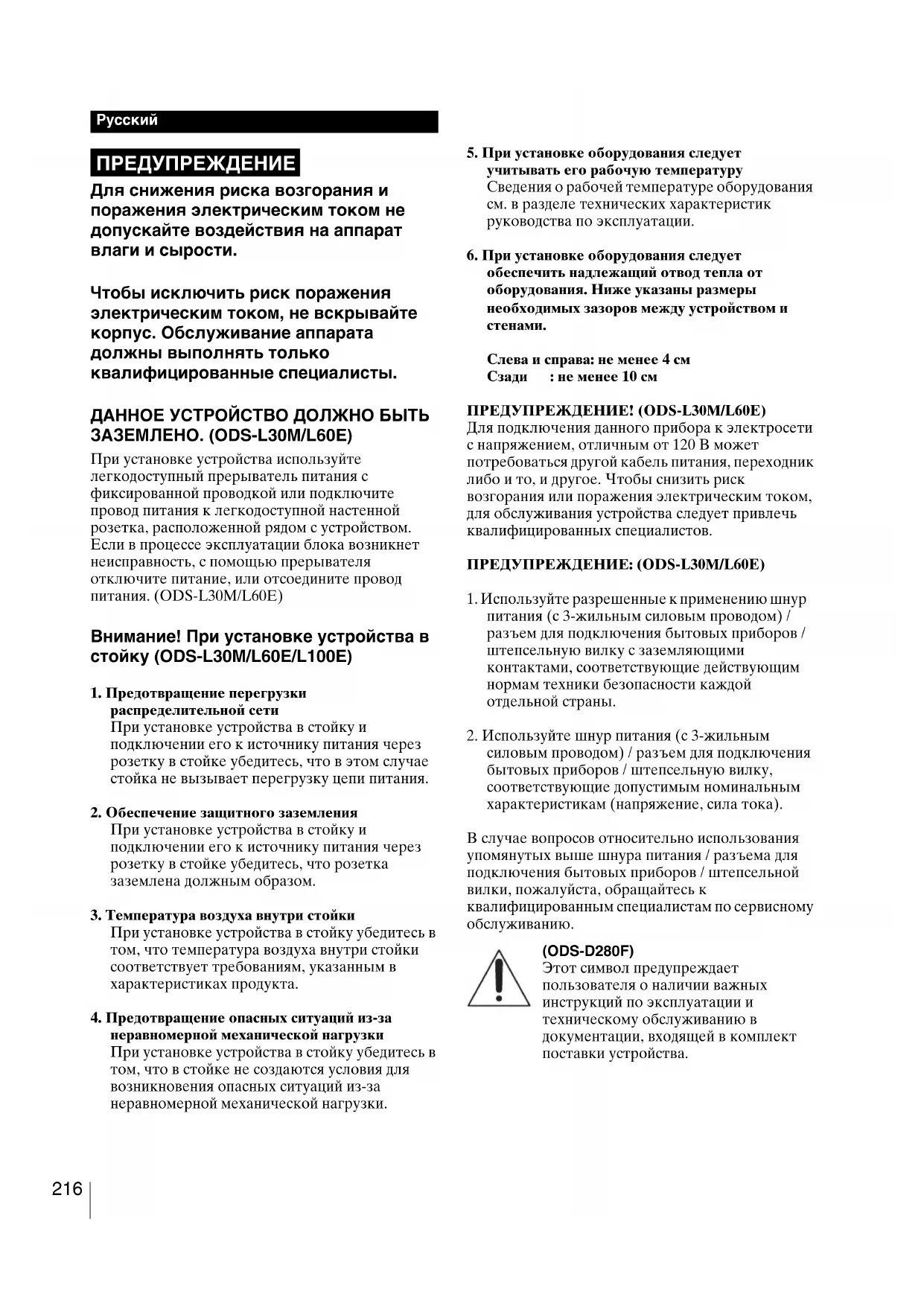 (PBDE) 实装基板 × ○ ○ ○ ○ ○ 外壳 × ○ ○ ○ ○ ○ 附属品 × ○ ○ ○ ○ ○216 Для снижения риска возгорания и поражения электрическим током не допускайте воздействия на аппарат влаги и сырости. Чтобы исключить риск поражения электрическим током, не вскрывайте корпус. Обслуживание аппарата должны выполнять только квалифицированные специалисты. ДАННОЕ УСТРОЙСТВО ДОЛЖНО БЫТЬ ЗАЗЕМЛЕНО. (ODS-L30M/L60E) При установке устройства используйте легкодоступный прерыватель питания с фиксированной проводкой или подключите провод питания к легкодоступной настенной розетка, расположенной рядом с устройством. Если в процессе эксплуатации блока возникнет неисправность, с помощью прерывателя отключите питание, или отсоедините провод питания. (ODS-L30M/L60E) Внимание! При установке устройства в стойку (ODS-L30M/L60E/L100E)