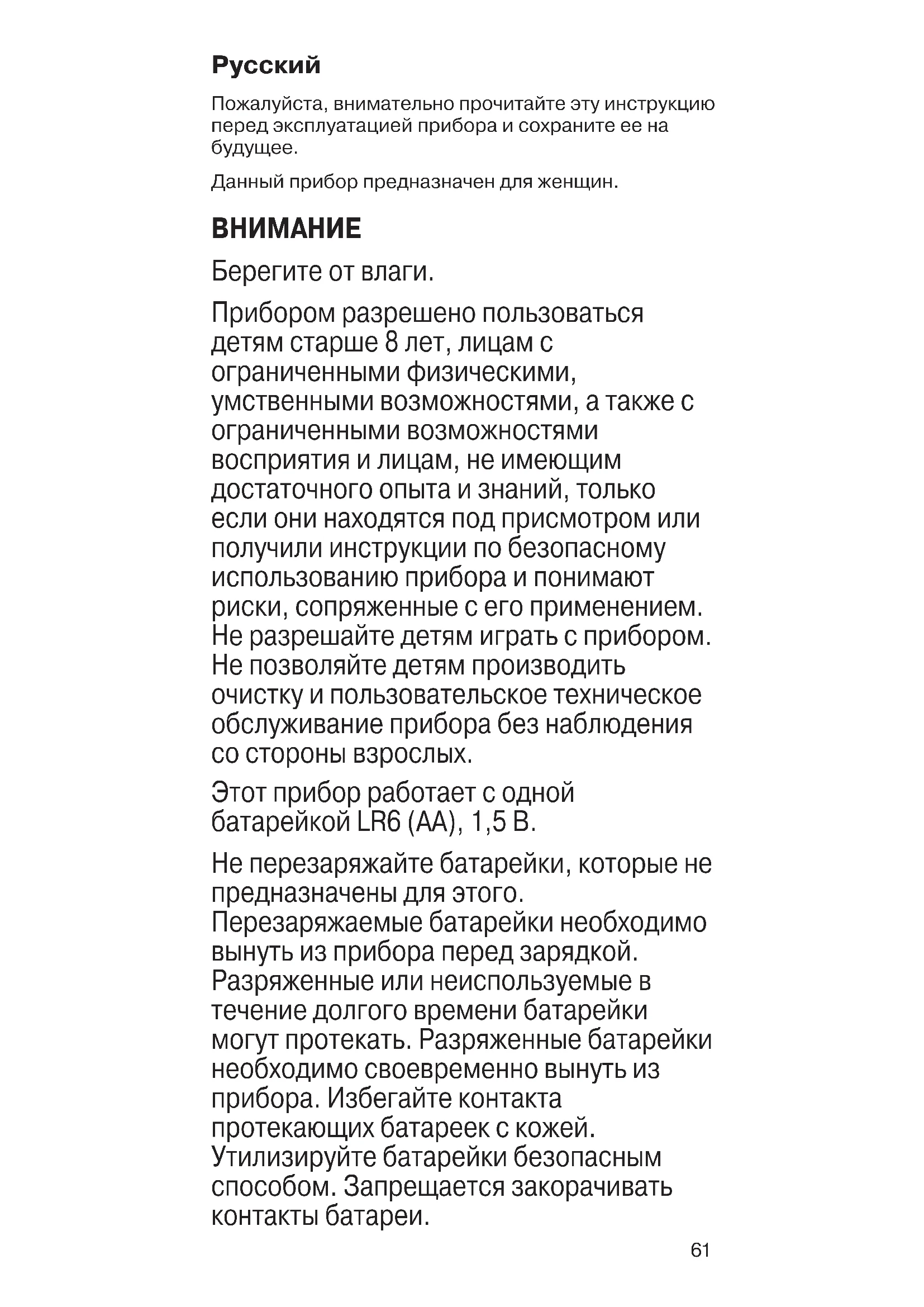 Берегите от влаги. Прибором разрешено пользоваться детям старше 8лет, лицам с ограниченными физическими, умственными возможностями, а также с ограниченными возможностями восприятия илицам, не имеющим достаточного опыта изнаний, только если они находятся под присмотром или получили инструкции по безопасному использованию прибора ипонимают риски, сопряженные с его применением. Не разрешайте детям играть с прибором. Не позволяйте детям производить очистку и пользовательское техническое обслуживание прибора без наблюдения со стороны взрослых. Этот прибор работает с одной батарейкой LR6 (АА), 1,5 В. Не перезаряжайте батарейки, которые не предназначены для этого. Перезаряжаемые батарейки необходимо вынуть из прибора перед зарядкой. Разряженные или неиспользуемые в течение долгого времени батарейки могут протекать. Разряженные батарейки необходимо своевременно вынуть из прибора. Избегайте контакта протекающих батареек с кожей. Утилизируйте батарейки безопасным способом. Запрещается закорачивать контакты батареи. 91090883_Face_Shaver_FS_1000_EURO.indd 6191090883_Face_Shaver_FS_1000_EURO.indd 61 19.02.20 13:0219.02.20 13:0262 В целях гигиены, прибор предназначен только для индивидуального использования. Не используйте прибор на раздраженной коже. Не используйте прибор с поврежденной бритвенной головкой. Описание и комплектность: 1 Защитная крышка 2 Бритвенная головка 3 Крышка переключателя 4 Щеточка для чистки A Инструкции по применению Снимите защитную крышку (1). Поверните крышку переключателя (3) в позицию «I», чтобы включить прибор. Медленно проведите по коже бритвенной головкой (2), удерживая ее в ровном положении. Используйте круговые или линейные движения. После использования верните переключатель в положение «O», чтобы выключить прибор. B Очистка Поверните бритвенную головку (2) против часовой стрелки и снимите ее. Аккуратно постучите бритвенной головкой о плоскую поверхность. Используйте щетку (4), чтобы удалить волоски с внутренней поверхности бритвенной головки. Не используйте щетку на лезвии. Не используйте воду для очищения бритвенной головки. Чтобы прикрепить бритвенную головку, поверните ее против часовой стрелки. C Замена батарейки Поверните переключатель (3) в положение ▼ и откройте отделение для батареек. Замените батарейки, соблюдаяправильнуюполярность. Закройте крышку переключателя, как показано, и закрепите его, повернув обратно в положение «O».