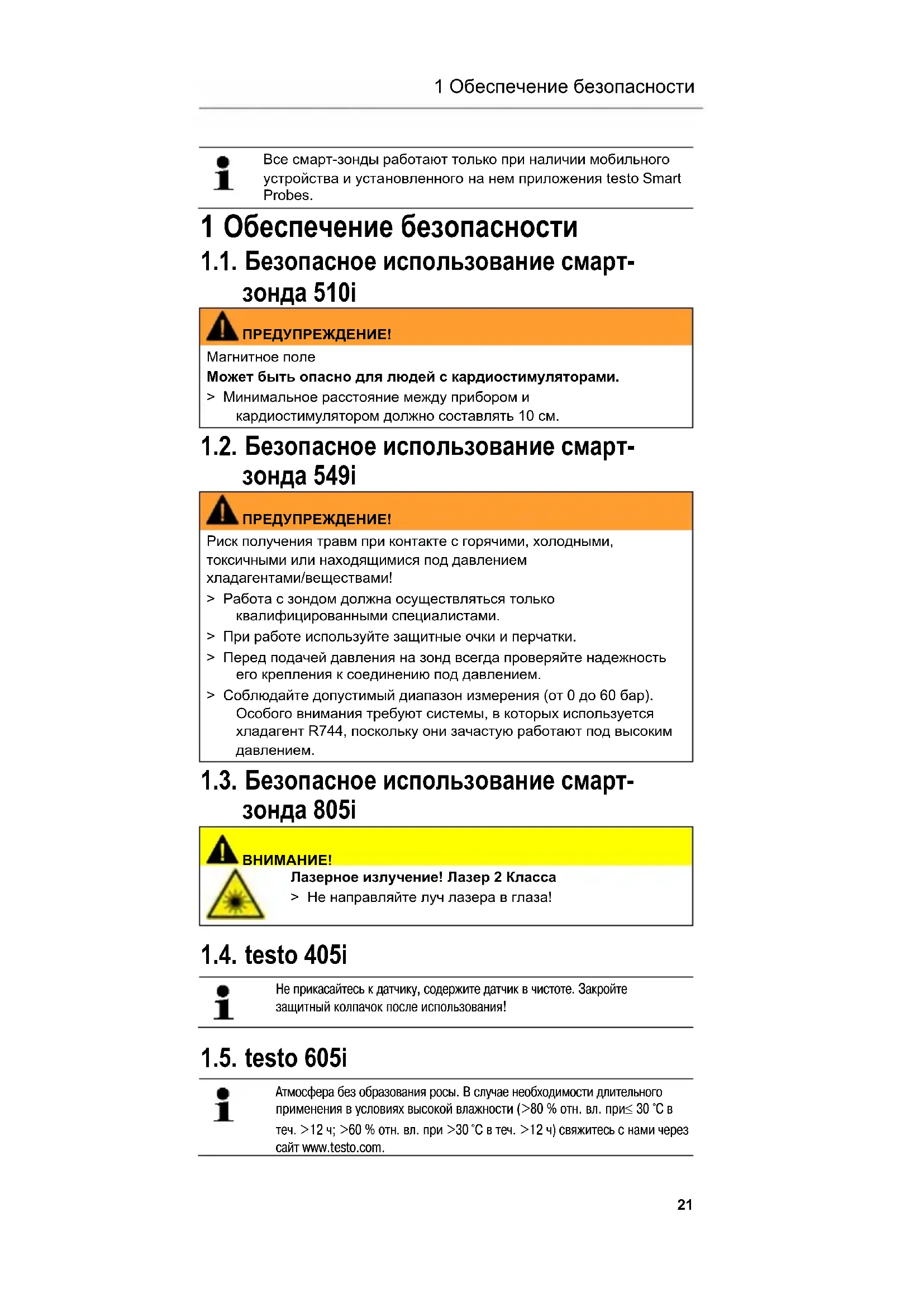 Все смарт-зонды работают только при наличии мобильного устройства и установленного на нем приложения testo Smart Probes. 1 Обеспечение безопасности 1.1. Безопасное использование смарт- зонда 510i ПРЕДУПРЕЖДЕНИЕ! Магнитное поле Может быть опасно для людей с кардиостимуляторами. > Минимальное расстояние между прибором и кардиостимулятором должно составлять 10 см. 1.2. Безопасное использование смарт- зонда 549i ПРЕДУПРЕЖДЕНИЕ! Риск получения травм при контакте с горячими, холодными, токсичными или находящимися под давлением хладагентами/веществами! > Работа с зондом должна осуществляться только квалифицированными специалистами. > При работе используйте защитные очки и перчатки. > Перед подачей давления на зонд всегда проверяйте надежность его крепления к соединению под давлением. > Соблюдайте допустимый диапазон измерения (от 0 до 60 бар). Особого внимания требуют системы, в которых используется хладагент R744, поскольку они зачастую работают под высоким