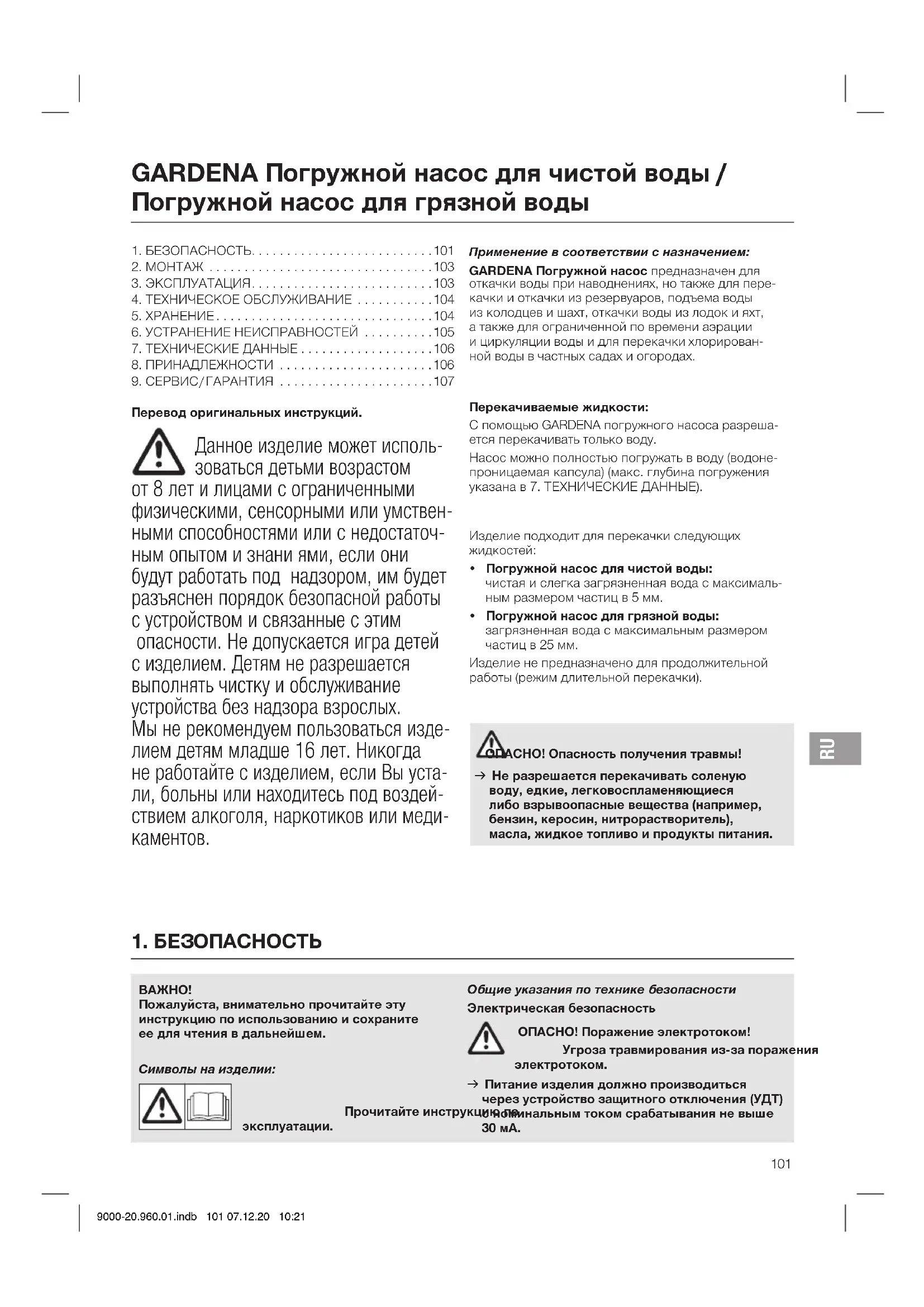 Пожалуйста, внимательно прочитайте эту инструкцию по использованию и сохраните ее для чтения в дальнейшем. Символы на изделии: Прочитайте инструкцию по эксплуатации. Общие указания по технике безопасности Электрическая безопасность ОПАСНО! Поражение электротоком! Угроза травмирования из-за поражения электротоком. v Питание изделия должно производиться через устройство защитного отключения (УДТ) с номинальным током срабатывания не выше 30 мА. GARDENA Погружной насос для чистой воды / Погружной насос для грязной воды