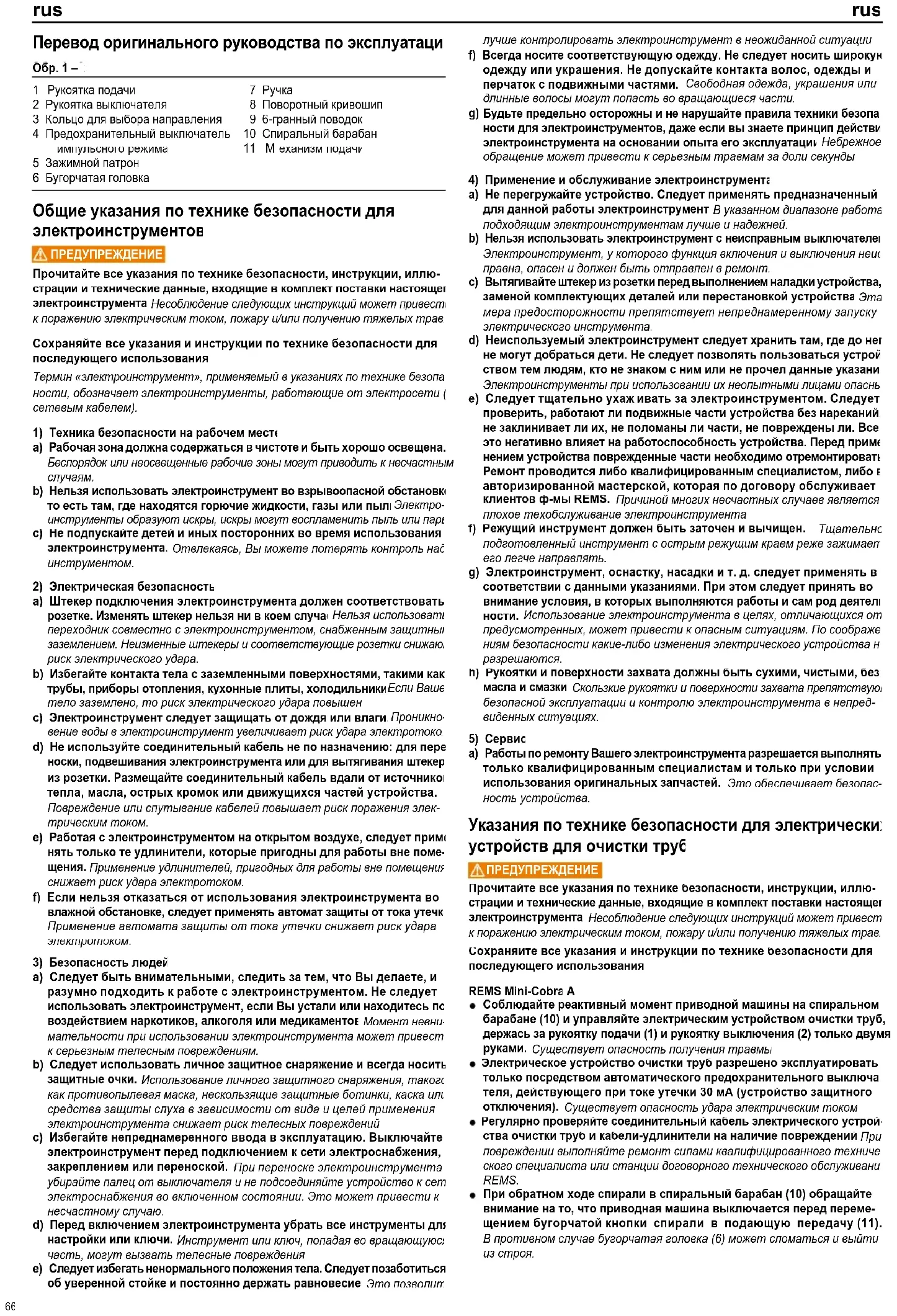 Прочитайте все указания по технике безопасности, инструкции, иллю- страции и технические данные, входящие в комплект поставки настоящего электроинструмента. Несоблюдение следующих инструкций может привести к поражению электрическим током, пожару и/или получению тяжелых травм. Сохраняйте все указания и инструкции по технике безопасности для последующего использования. REMS Mini-Cobra