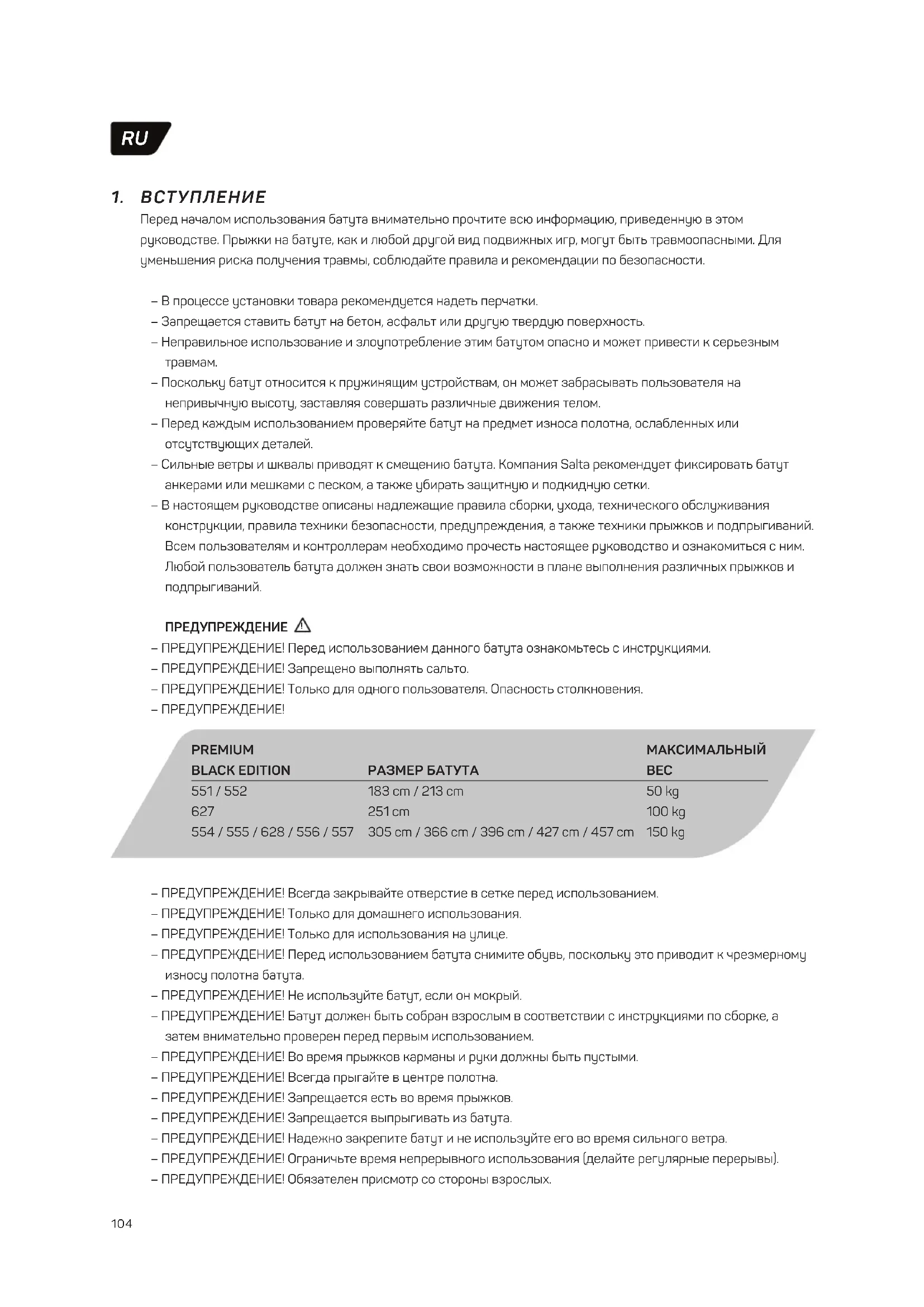– Поскольку батут относится к пружинящим устройствам, он может забрасывать пользователя на непривычную высоту, заставляя совершать различные движения телом. – Перед каждым использованием проверяйте батут на предмет износа полотна, ослабленных или отсутствующих деталей. – Сильные ветры и шквалы приводят к смещению батута. Компания Salta рекомендует фиксировать батут анкерами или мешками с песком, а также убирать защитную и подкидную сетки. – В настоящем руководстве описаны надлежащие правила сборки, ухода, технического обслуживания конструкции, правила техники безопасности, предупреждения, а также техники прыжков и подпрыгиваний. Всем пользователям и контроллерам необходимо прочесть настоящее руководство и ознакомиться с ним. Любой пользователь батута должен знать свои возможности в плане выполнения различных прыжков и подпрыгиваний. ПРЕДУПРЕЖДЕНИЕ – ПРЕДУПРЕЖДЕНИЕ! Перед использованием данного батута ознакомьтесь с инструкциями. – ПРЕДУПРЕЖДЕНИЕ! Запрещено выполнять сальто. – ПРЕДУПРЕЖДЕНИЕ! Только для одного пользователя. Опасность столкновения. – ПРЕДУПРЕЖДЕНИЕ!
