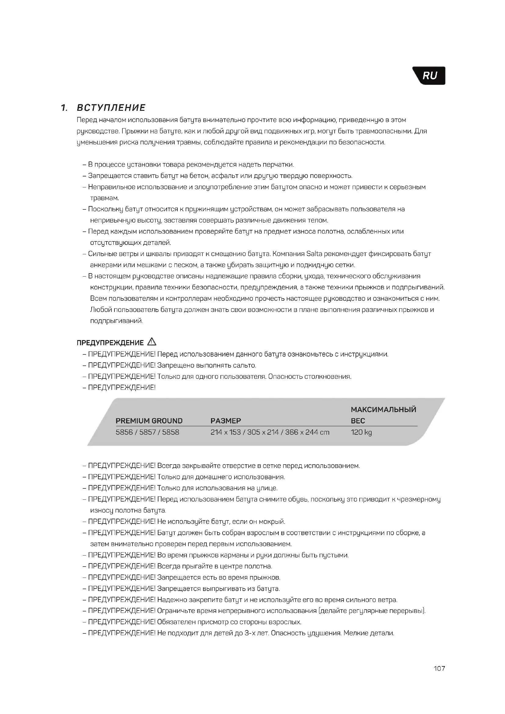 – Поскольку батут относится к пружинящим устройствам, он может забрасывать пользователя на непривычную высоту, заставляя совершать различные движения телом. – Перед каждым использованием проверяйте батут на предмет износа полотна, ослабленных или отсутствующих деталей. – Сильные ветры и шквалы приводят к смещению батута. Компания Salta рекомендует фиксировать батут анкерами или мешками с песком, а также убирать защитную и подкидную сетки. – В настоящем руководстве описаны надлежащие правила сборки, ухода, технического обслуживания конструкции, правила техники безопасности, предупреждения, а также техники прыжков и подпрыгиваний. Всем пользователям и контроллерам необходимо прочесть настоящее руководство и ознакомиться с ним. Любой пользователь батута должен знать свои возможности в плане выполнения различных прыжков и подпрыгиваний. ПРЕДУПРЕЖДЕНИЕ – ПРЕДУПРЕЖДЕНИЕ! Перед использованием данного батута ознакомьтесь с инструкциями. – ПРЕДУПРЕЖДЕНИЕ! Запрещено выполнять сальто. – ПРЕДУПРЕЖДЕНИЕ! Только для одного пользователя. Опасность столкновения. – ПРЕДУПРЕЖДЕНИЕ!