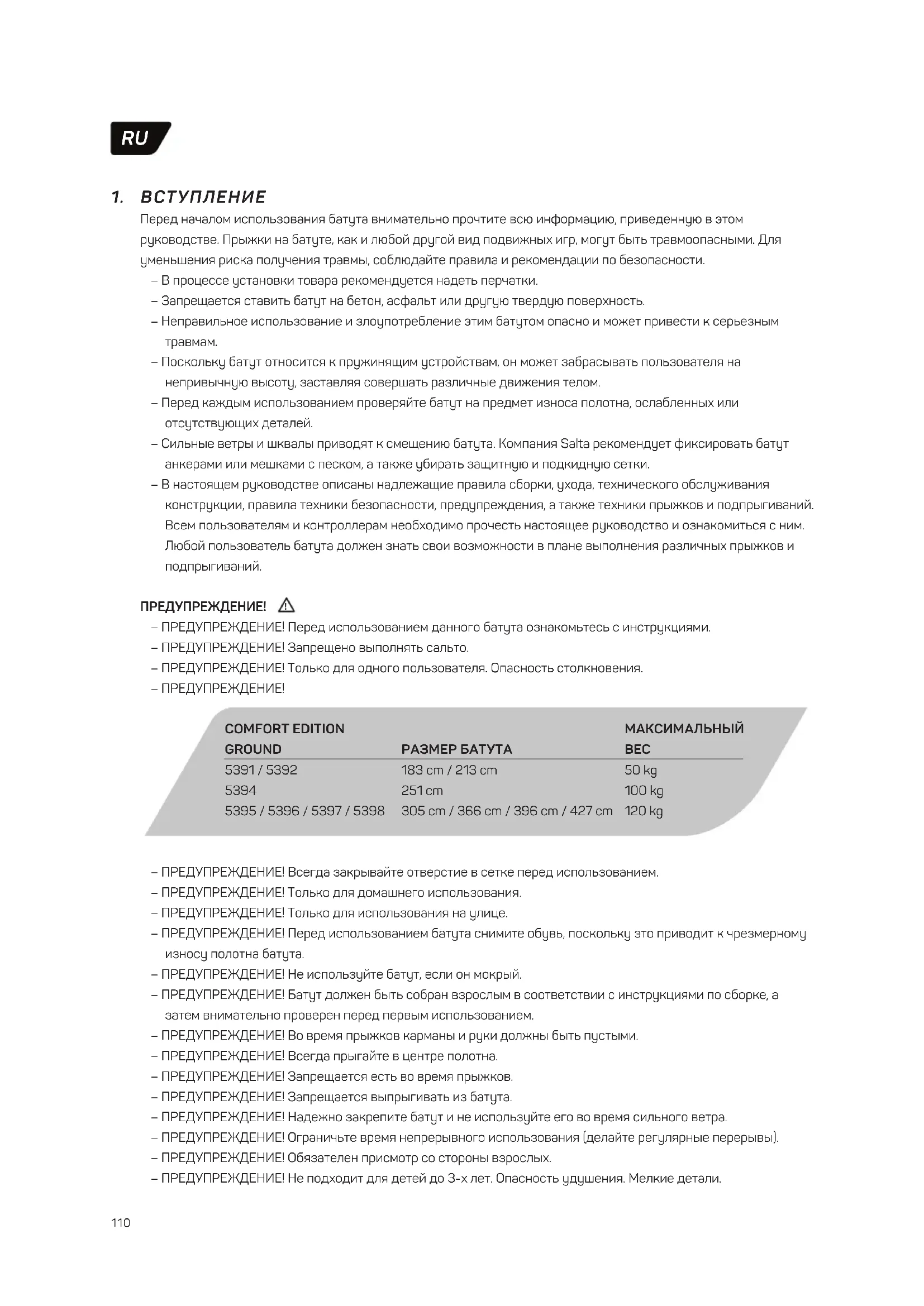 – Поскольку батут относится к пружинящим устройствам, он может забрасывать пользователя на непривычную высоту, заставляя совершать различные движения телом. – Перед каждым использованием проверяйте батут на предмет износа полотна, ослабленных или отсутствующих деталей. – Сильные ветры и шквалы приводят к смещению батута. Компания Salta рекомендует фиксировать батут анкерами или мешками с песком, а также убирать защитную и подкидную сетки. – В настоящем руководстве описаны надлежащие правила сборки, ухода, технического обслуживания конструкции, правила техники безопасности, предупреждения, а также техники прыжков и подпрыгиваний. Всем пользователям и контроллерам необходимо прочесть настоящее руководство и ознакомиться с ним. Любой пользователь батута должен знать свои возможности в плане выполнения различных прыжков и подпрыгиваний. ПРЕДУПРЕЖДЕНИЕ! – ПРЕДУПРЕЖДЕНИЕ! Перед использованием данного батута ознакомьтесь с инструкциями. – ПРЕДУПРЕЖДЕНИЕ! Запрещено выполнять сальто. – ПРЕДУПРЕЖДЕНИЕ! Только для одного пользователя. Опасность столкновения. – ПРЕДУПРЕЖДЕНИЕ!