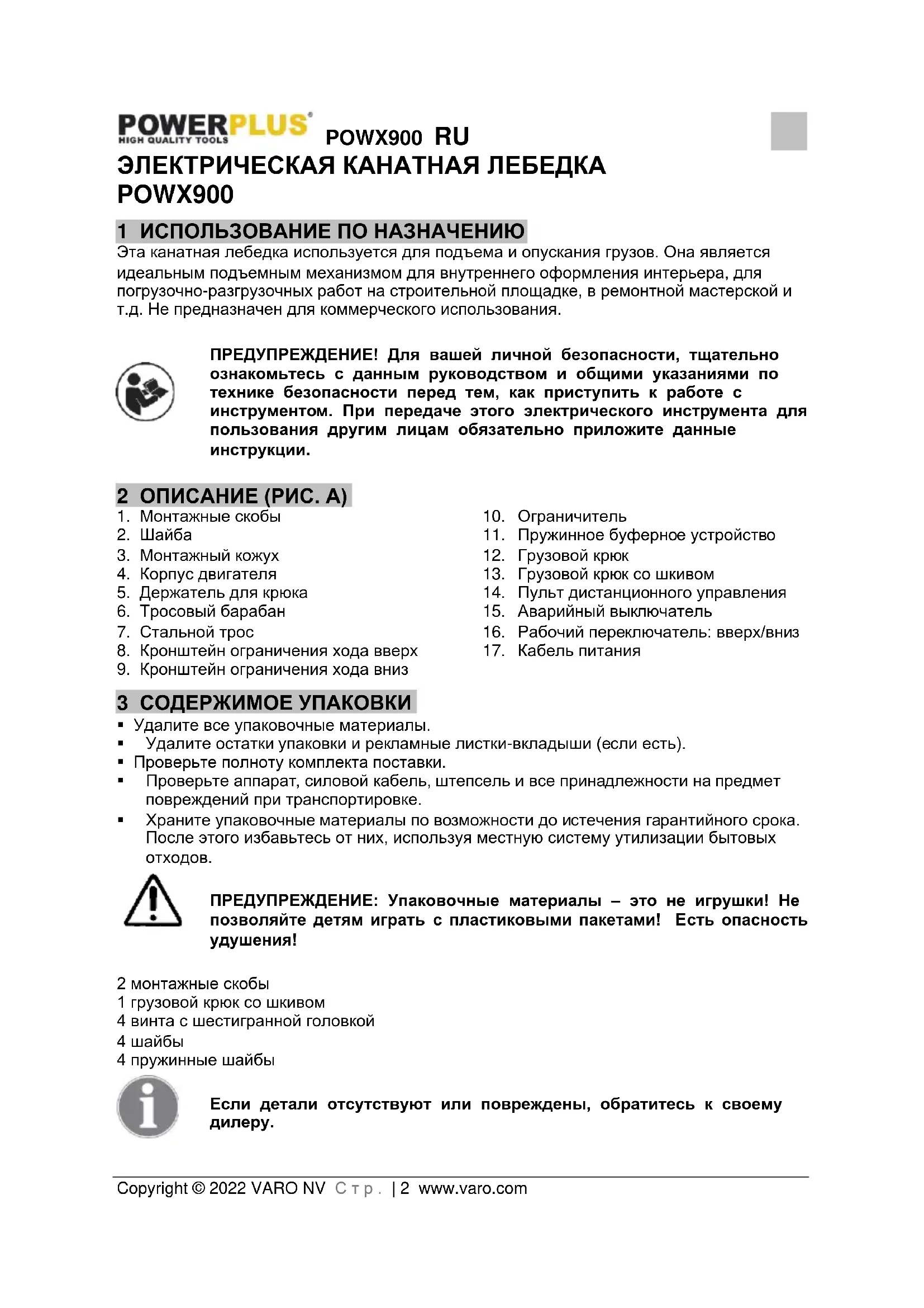 - 16 ДЕКЛАРАЦИЯ О СООТВЕТСТВИИ POWX900 RU Copyright © 2022 VARO NV С т р . | 2 www.varo.com ЭЛЕКТРИЧЕСКАЯ КАНАТНАЯ ЛЕБЕДКА POWX900 1 ИСПОЛЬЗОВАНИЕ ПО НАЗНАЧЕНИЮ Эта канатная лебедка используется для подъема и опускания грузов. Она является идеальным подъемным механизмом для внутреннего оформления интерьера, для погрузочно-разгрузочных работ на строительной площадке, в ремонтной мастерской и т.д. Не предназначен для коммерческого использования. ПРЕДУПРЕЖДЕНИЕ! Для вашей личной безопасности, тщательно ознакомьтесь с данным руководством и общими указаниями по технике безопасности перед тем, как приступить к работе с инструментом. При передаче этого электрического инструмента для пользования другим лицам обязательно приложите данные инструкции. 2 ОПИСАНИЕ (РИС. A) p. 13