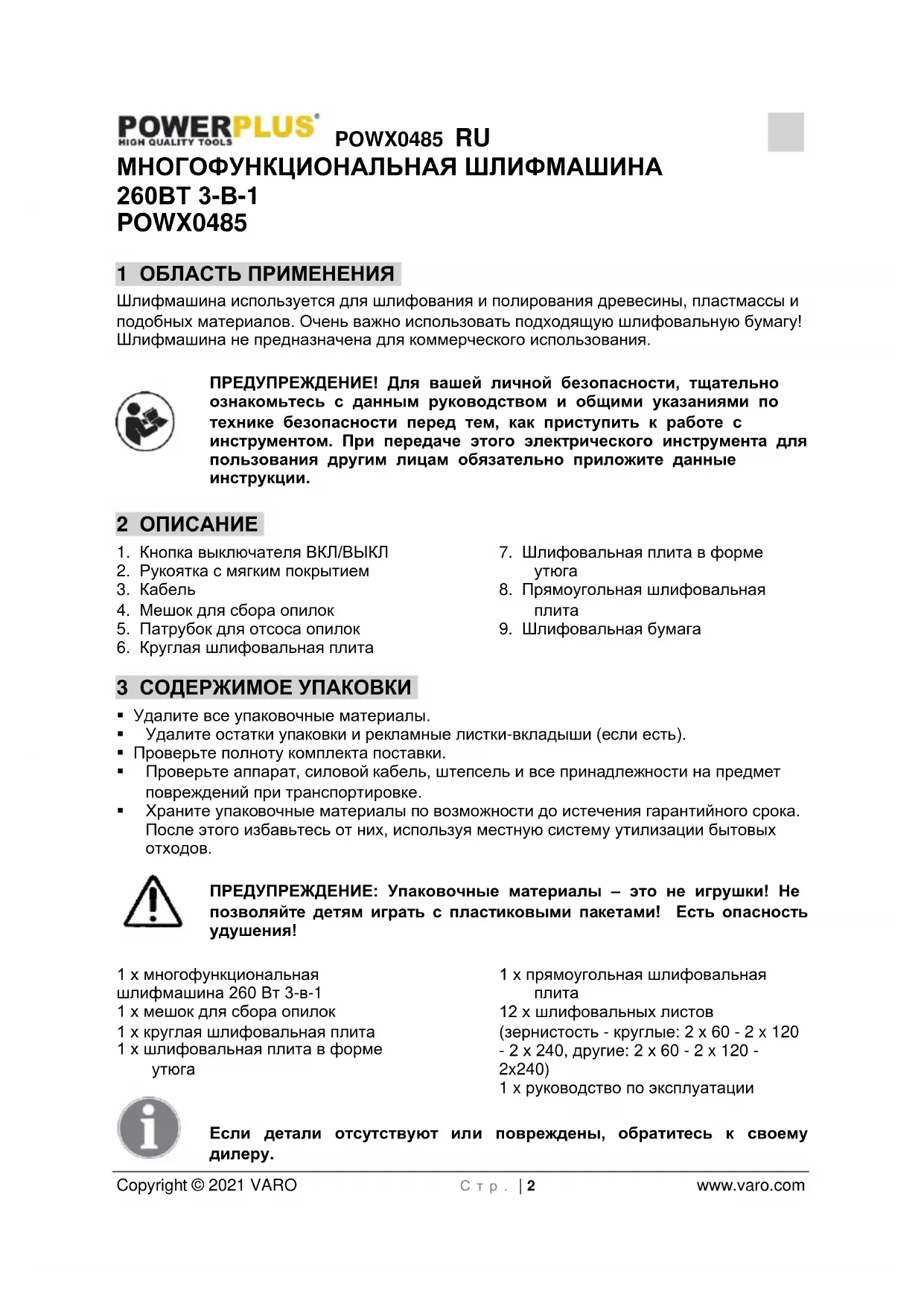 - 15 ДЕКЛАРАЦИЯ СООТВЕТСТВИЯ POWX0485 RU Copyright © 2021 VARO С т р . | 2 www.varo.com МНОГОФУНКЦИОНАЛЬНАЯ ШЛИФМАШИНА 260ВТ 3-В-1 POWX0485 1 ОБЛАСТЬ ПРИМЕНЕНИЯ Шлифмашина используется для шлифования и полирования древесины, пластмассы и подобных материалов. Очень важно использовать подходящую шлифовальную бумагу! Шлифмашина не предназначена для коммерческого использования. ПРЕДУПРЕЖДЕНИЕ! Для вашей личной безопасности, тщательно ознакомьтесь с данным руководством и общими указаниями по технике безопасности перед тем, как приступить к работе с инструментом. При передаче этого электрического инструмента для пользования другим лицам обязательно приложите данные инструкции. 2 ОПИСАНИЕ p. 10