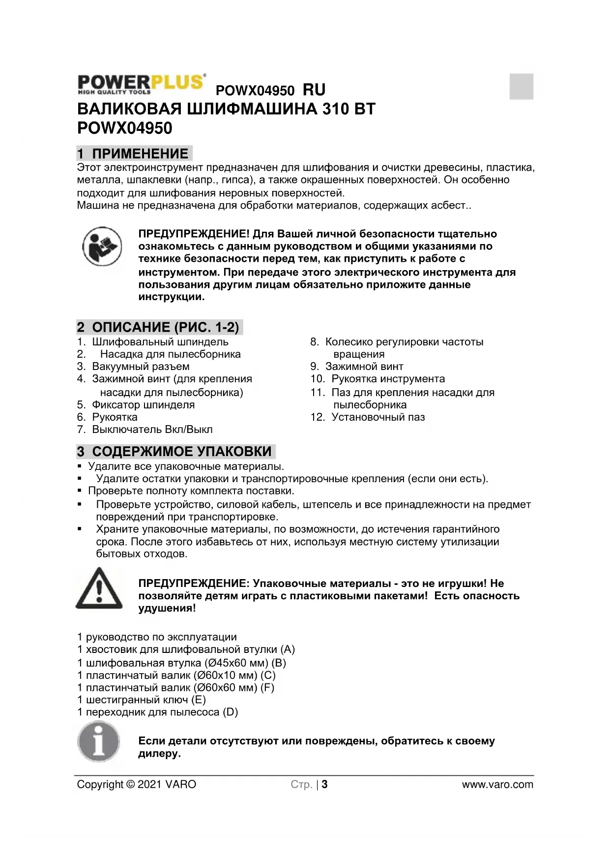 - POWX04950 RU Copyright © 2021 VARO Стр. | 2 www.varo.com 14 ДЕКЛАРАЦИЯ О СООТВЕТСТВИИ POWX04950 RU Copyright © 2021 VARO Стр. | 3 www.varo.com ВАЛИКОВАЯ ШЛИФМАШИНА 310 ВТ POWX04950 1 ПРИМЕНЕНИЕ Этот электроинструмент предназначен для шлифования и очистки древесины, пластика, металла, шпаклевки (напр., гипса), а также окрашенных поверхностей. Он особенно подходит для шлифования неровных поверхностей. Машина не предназначена для обработки материалов, содержащих асбест ПРЕДУПРЕЖДЕНИЕ! Для Вашей личной безопасности тщательно ознакомьтесь с данным руководством и общими указаниями по технике безопасности перед тем, как приступить к работе с инструментом. При передаче этого электрического инструмента для пользования другим лицам обязательно приложите данные инструкции. 2 ОПИСАНИЕ (РИС. 1-2) p. 12