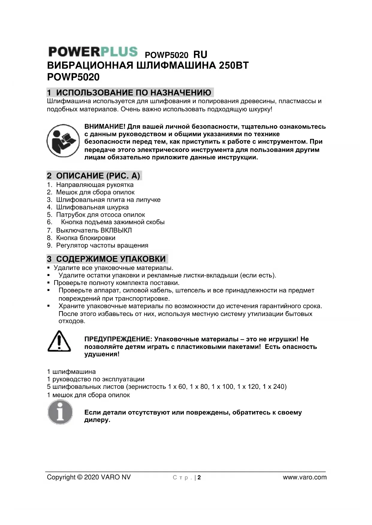 - 14 ДЕКЛАРАЦИЯ О СООТВЕТСТВИИ POWP5020 RU Copyright © 2020 VARO NV С т р . | 2 www.varo.com ВИБРАЦИОННАЯ ШЛИФМАШИНА 250ВТ POWP5020 1 ИСПОЛЬЗОВАНИЕ ПО НАЗНАЧЕНИЮ Шлифмашина используется для шлифования и полирования древесины, пластмассы и подобных материалов. Очень важно использовать подходящую шкурку! ВНИМАНИЕ! Для вашей личной безопасности, тщательно ознакомьтесь с данным руководством и общими указаниями по технике безопасности перед тем, как приступить к работе с инструментом. При передаче этого электрического инструмента для пользования другим лицам обязательно приложите данные инструкции. 2 ОПИСАНИЕ (РИС. A) p. 9