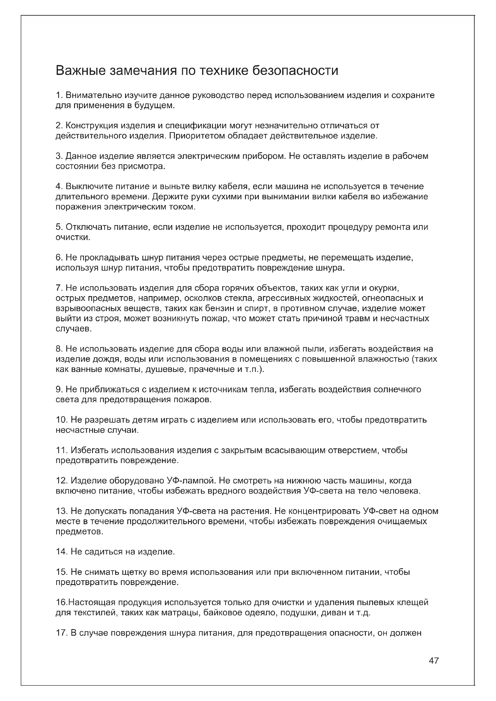 предотвратить повреждение. 16.Настоящая продукция используется только для очистки и удаления пылевых клещей для текстилей, таких как матрацы, байковое одеяло, подушки, диван и т.д.
