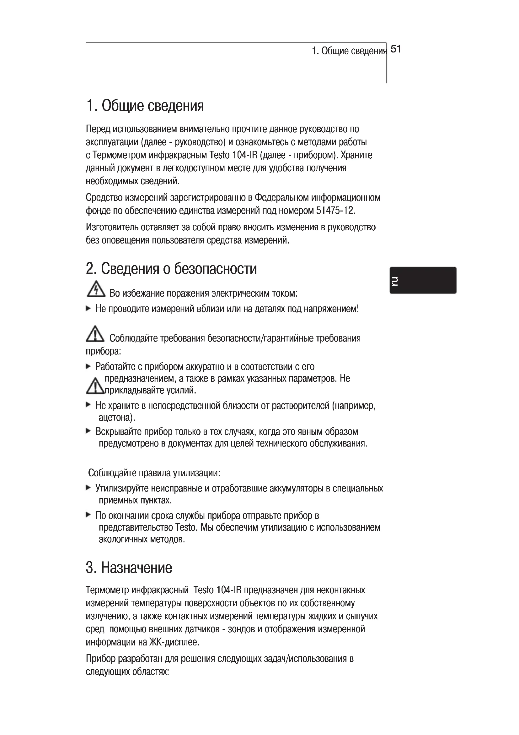 Перед использованием внимательно прочтите данное руководство по эксплуатации (далее - руководство) и ознакомьтесь с методами работы с Термометром инфракрасным Testo 104-IR (далее - прибором). Храните данный документ в легкодоступном месте для удобства получения необходимых сведений. Средство измерений зарегистрированно в Федеральном информационном фонде по обеспечению единства измерений под номером 51475-12. Изготовитель оставляет за собой право вносить изменения в руководство без оповещения пользователя средства измерений.