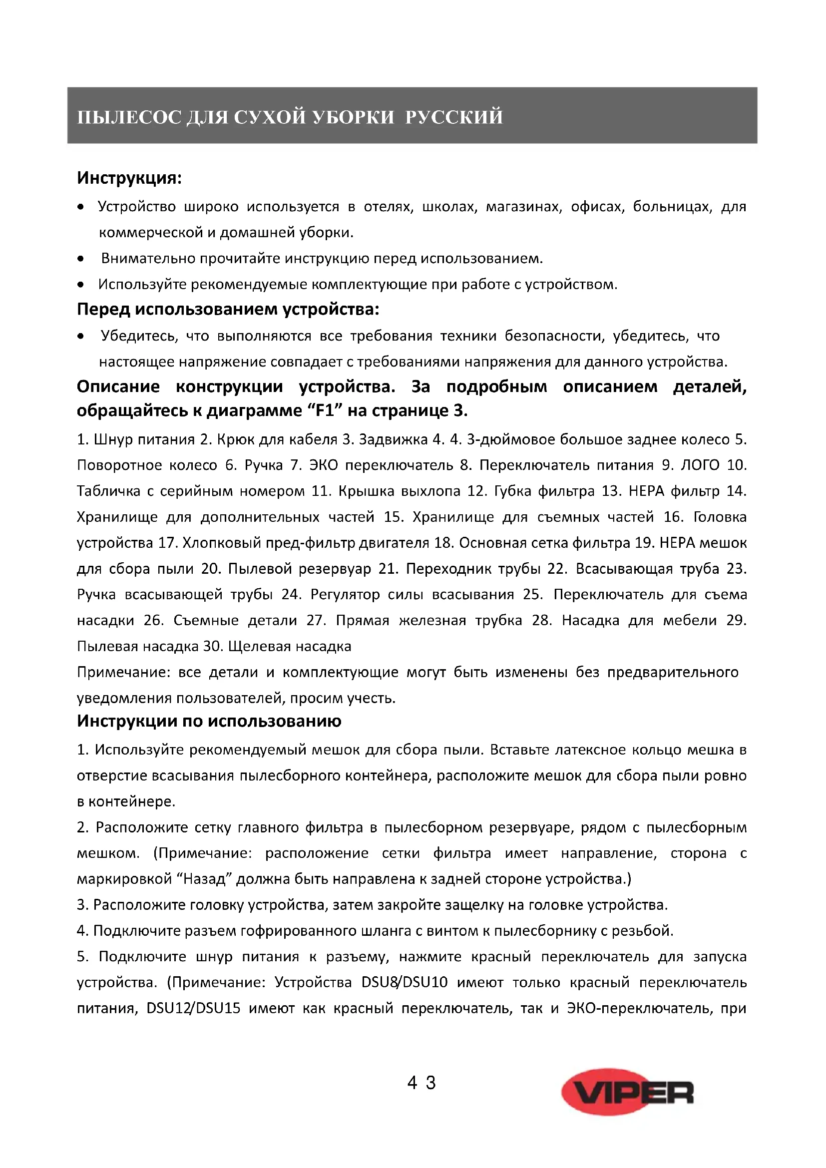 F4, modul incorect de transport al aspiratorului cu depozitarea accesoriilor se poate vedea în imaginileF5 Schema circuitelor electrice Schema circuitelor electrice la modelele DSU8/DSU10 se poate vedea la F8. Schema circuitelor electrice la modelele DSU12/DSU15 se pot vedea la F9. Parametri specificaţie produs Pentru parametrii specificaţie consultaţi "F10".. 42ПЫЛЕСОС ДЛЯ СУХОЙ УБОРКИ РУССКИЙ Инструкция: Устройство широко используется в отелях, школах, магазинах, офисах, больницах, для коммерческой и домашней уборки. Внимательно прочитайте инструкцию перед использованием. Используйте рекомендуемые комплектующие при работе с устройством. Перед использованием устройства: Убедитесь, что выполняются все требования техники безопасности, убедитесь, что настоящее напряжение совпадает с требованиями напряжения для данного устройства. Описание конструкции устройства. За подробным описанием деталей, обращайтесь к диаграмме “F1” на странице 3.
