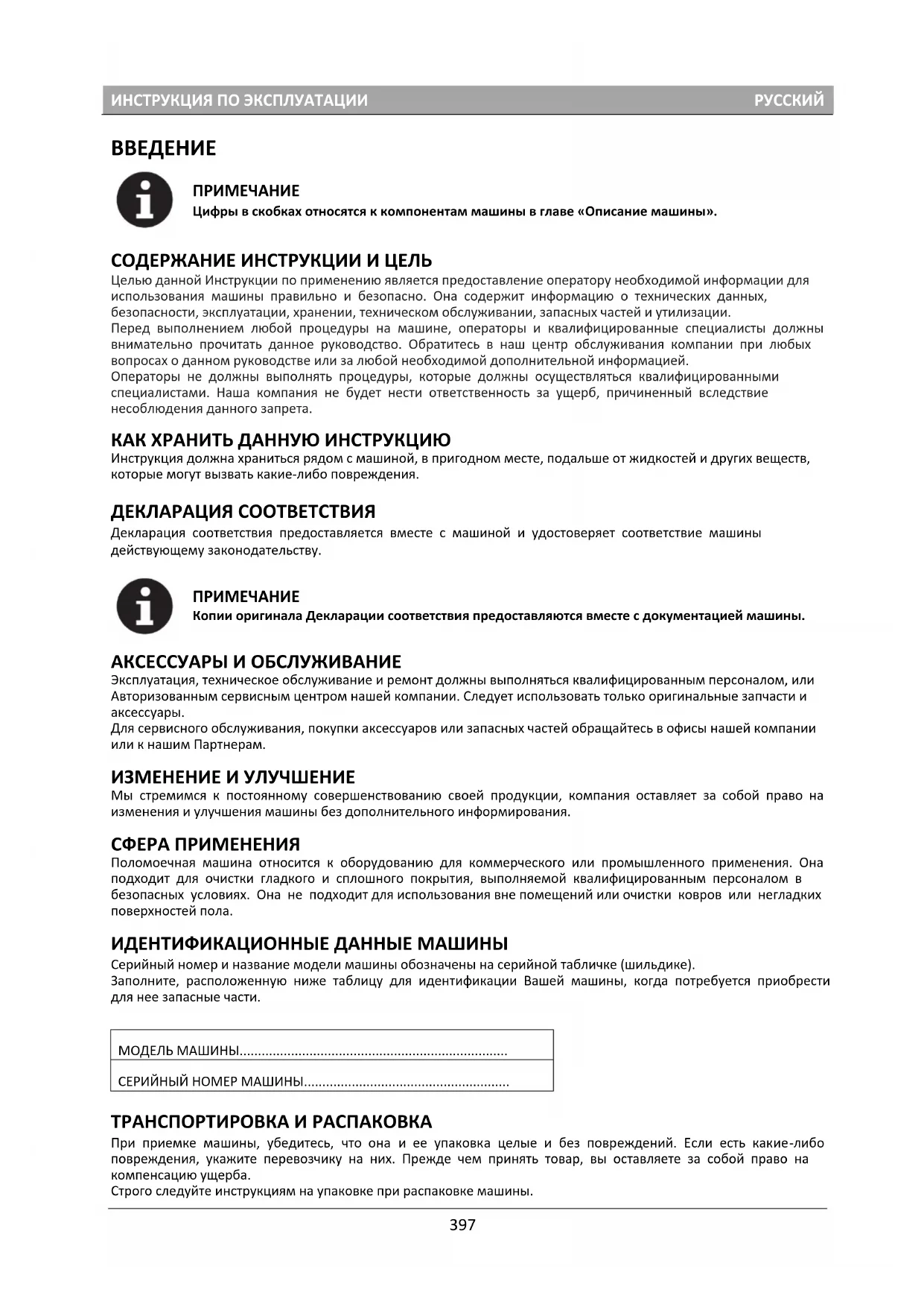 Копии оригинала Декларации соответствия предоставляются вместе с документацией машины. АКСЕССУАРЫ И ОБСЛУЖИВАНИЕ Эксплуатация, техническое обслуживание и ремонт должны выполняться квалифицированным персоналом, или Авторизованным сервисным центром нашей компании. Следует использовать только оригинальные запчасти и аксессуары. Для сервисного обслуживания, покупки аксессуаров или запасных частей обращайтесь в офисы нашей компании или к нашим Партнерам. ИЗМЕНЕНИЕ И УЛУЧШЕНИЕ Мы стремимся к постоянному совершенствованию своей продукции, компания оставляет за собой право на изменения и улучшения машины без дополнительного информирования. СФЕРА ПРИМЕНЕНИЯ Поломоечная машина относится к оборудованию для коммерческого или промышленного применения. Она подходит для очистки гладкого и сплошного покрытия, выполняемой квалифицированным персоналом в безопасных условиях. Она не подходит для использования вне помещений или очистки ковров или негладких поверхностей пола. ИДЕНТИФИКАЦИОННЫЕ ДАННЫЕ МАШИНЫ Серийный номер и название модели машины обозначены на серийной табличке (шильдике). Заполните, расположенную ниже таблицу для идентификации Вашей машины, когда потребуется приобрести для нее запасные части. МОДЕЛЬ МАШИНЫ......................................................................... СЕРИЙНЫЙ НОМЕР МАШИНЫ........................................................ ТРАНСПОРТИРОВКА И РАСПАКОВКА При приемке машины, убедитесь, что она и ее упаковка целые и без повреждений. Если есть какие-либо повреждения, укажите перевозчику на них. Прежде чем принять товар, вы оставляете за собой право на компенсацию ущерба. Строго следуйте инструкциям на упаковке при распаковке машины. 397ИНСТРУКЦИЯ ПО ЭКСПЛУАТАЦИИ