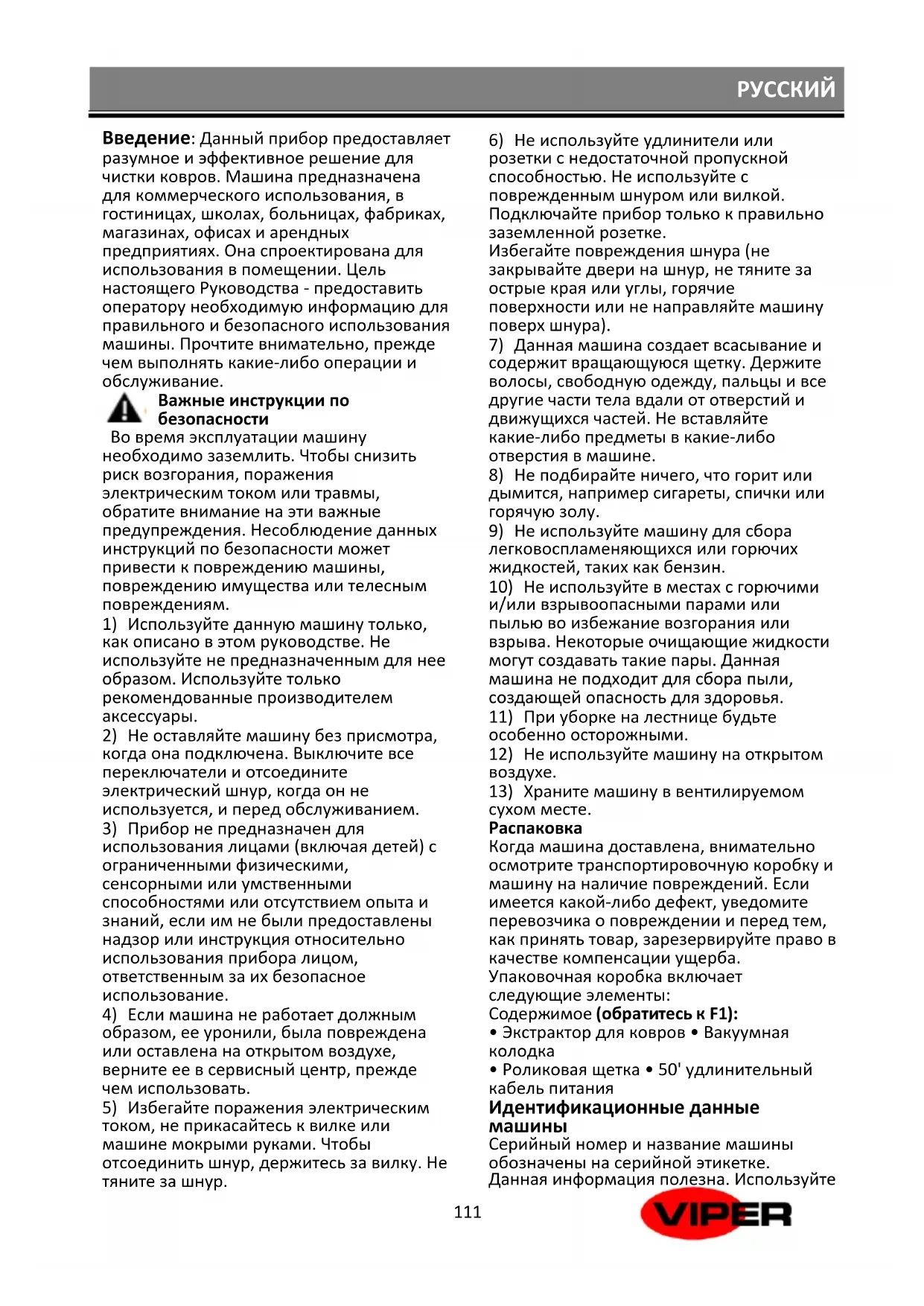 Введение: Данный прибор предоставляет разумное и эффективное решение для чистки ковров. Машина предназначена для коммерческого использования, в гостиницах, школах, больницах, фабриках, магазинах, офисах и арендных предприятиях. Она спроектирована для использования в помещении. Цель настоящего Руководства - предоставить оператору необходимую информацию для правильного и безопасного использования машины. Прочтите внимательно, прежде чем выполнять какие-либо операции и обслуживание.