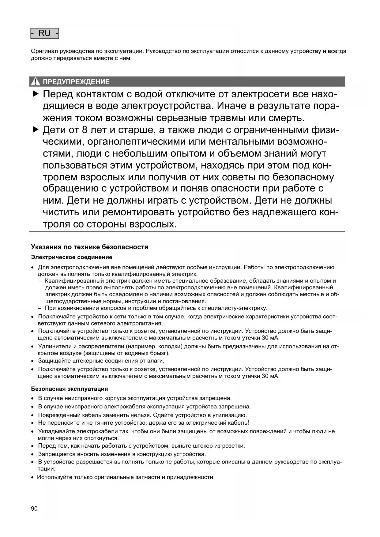ПРЕДУПРЕЖДЕНИЕ ПРЕДУПРЕЖДЕНИЕ Перед контактом с водой отключите от электросети все нахо- дящиеся в воде электроустройства. Иначе в результате пора- жения током возможны серьезные травмы или смерть. Дети от 8 лет и старше, а также люди с ограниченными физи- ческими, органолептическими или ментальными возможно- стями, люди с небольшим опытом и объемом знаний могут пользоваться этим устройством, находясь при этом под кон- тролем взрослых или получив от них советы по безопасному обращению с устройством и поняв опасности при работе с ним. Дети не должны играть с устройством. Дети не должны чистить или ремонтировать устройство без надлежащего кон- троля со стороны взрослых.