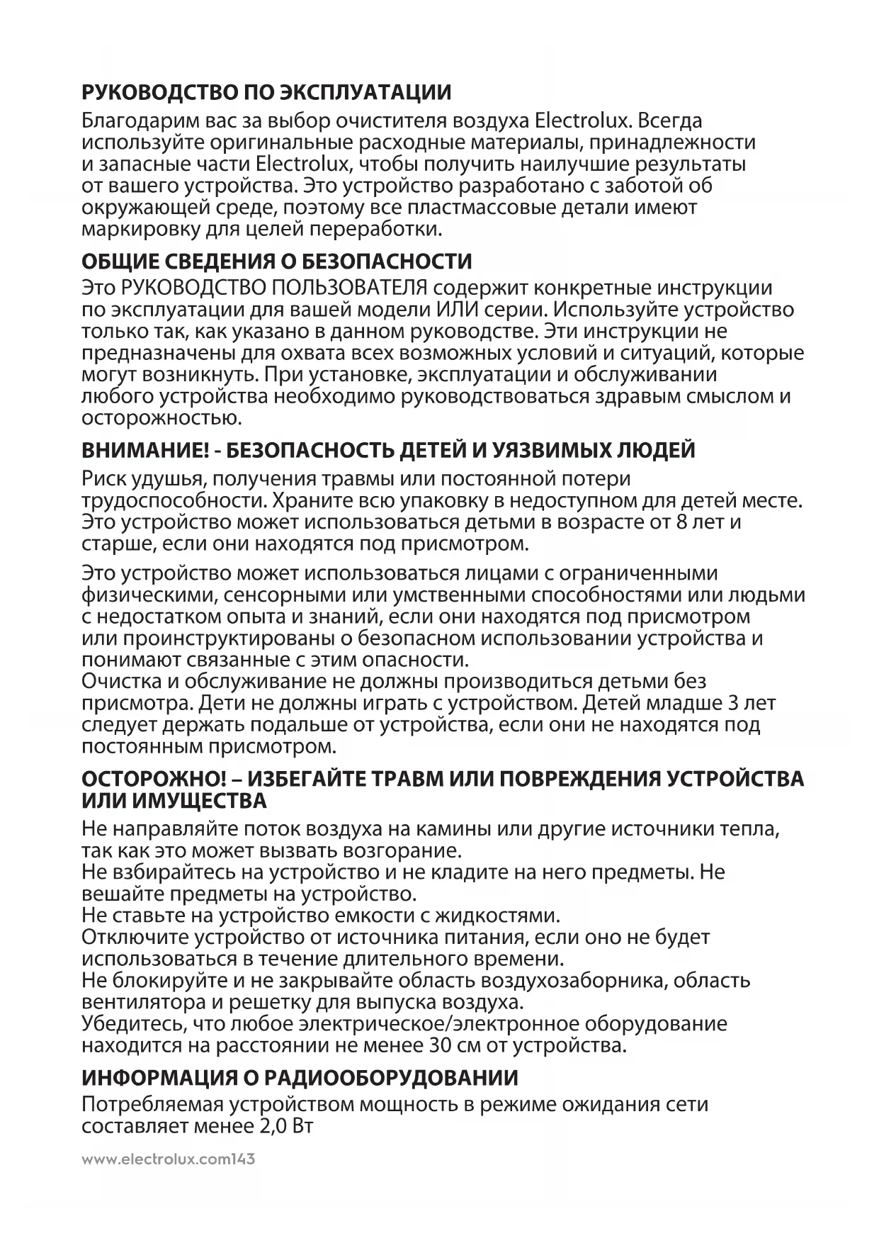 8 Pictograma filtrului este aprinsă, chiar dacă am schimbat recent filtrele OPRIȚI unitatea cu butonul PORNIRE/OPRIRE sau deconectați și reconectați unitatea, pentru a vedea dacă pictograma dispare. Este important să opriți unitatea înainte de a schimba filtrul, pentru a reseta produsul. 9 Purificatorul de aer sau ventilatorul nu funcționează Indicatorul de umplere cu apă clipește. Asigurați-vă că rezervorul de apă este instalat corect și că există suficientă apă în rezervorul de apă. Asigurați-vă că panoul lateral este închis. 10 Există unele depuneri albe sau galbene pe filtrul de umidificare Depozitele albe se numesc calcar și constau în minerale din apă. Calcarul de pe filtrul rotativ de umidificare afectează performanța de umidificare, dar nu dăunează sănătății. Urmați instrucțiunile de curățare din manualul de utilizare. 11 Este nevoie de mult timp pentru a atinge nivelul țintă de umiditate Tehnologia de umidificare distribuie uniform vaporii de apă invizibili în camera dvs. În condițiile unui aer uscat, umezeala de la umidificator va fi absorbită de pereți, mobilier și alte obiecte din camera dumneavoastră. Ventilația aerului uscat exterior va crește, de asemenea, timpul necesar pentru a atinge umiditatea țintă. Pentru a optimiza performanța de umidificare și purificare, se recomandă închiderea ușilor și ferestrelor în timpul utilizării. Schimbați filtrul de umidificare în fiecare an. 12 Nu pot conecta purificatorul de aer la aplicație Dacă nu reușiți să îmbarcați unitatea și să o conectați la aplicația Electrolux după câteva încercări, atunci vă rugăm să contactați un centru de service autorizat Electrolux pentru asistență. Cipul WiFi din unitate funcționează doar la 2,4 GHz, așa că vă rugăm să vă asigurați că WiFi-ul de acasă funcționează la această lățime de bandă. 13 Am o altă problemă care nu este listată aici SAU niciunul dintre pașii de mai sus nu a ajutat la rezolvarea problemei Puteți căuta mai multe ghiduri de depanare și întrebări frecvente pe site-ul nostru web SAU în aplicația Electrolux din paginile cu informații despre produs sau puteți contacta direct centrul de service autorizat Electrolux pentru asistență. Mulțumim! Vă rugăm să aveți la dispoziție PNC și numărul de serie al unității atunci când contactați serviciul Electrolux. Aceste informații pot găsite pe eticheta de clasicare care se aă pe unitatea principală, în spatele capacului frontal.www.electrolux.com 143 РУКОВОДСТВО ПО ЭКСПЛУАТАЦИИ Благодарим вас за выбор очистителя воздуха Electrolux. Всегда используйте оригинальные расходные материалы, принадлежности и запасные части Electrolux, чтобы получить наилучшие результаты от вашего устройства. Это устройство разработано с заботой об окружающей среде, поэтому все пластмассовые детали имеют маркировку для целей переработки. ОБЩИЕ СВЕДЕНИЯ О БЕЗОПАСНОСТИ Это РУКОВОДСТВО ПОЛЬЗОВАТЕЛЯ содержит конкретные инструкции по эксплуатации для вашей модели ИЛИ серии. Используйте устройство только так, как указано в данном руководстве. Эти инструкции не предназначены для охвата всех возможных условий и ситуаций, которые могут возникнуть. При установке, эксплуатации и обслуживании любого устройства необходимо руководствоваться здравым смыслом и осторожностью. ВНИМАНИЕ! - БЕЗОПАСНОСТЬ ДЕТЕЙ И УЯЗВИМЫХ ЛЮДЕЙ Риск удушья, получения травмы или постоянной потери трудоспособности. Храните всю упаковку в недоступном для детей месте. Это устройство может использоваться детьми в возрасте от 8 лет и старше, если они находятся под присмотром. Это устройство может использоваться лицами с ограниченными физическими, сенсорными или умственными способностями или людьми с недостатком опыта и знаний, если они находятся под присмотром или проинструктированы о безопасном использовании устройства и понимают связанные с этим опасности. Очистка и обслуживание не должны производиться детьми без присмотра. Дети не должны играть с устройством. Детей младше 3 лет следует держать подальше от устройства, если они не находятся под постоянным присмотром. ОСТОРОЖНО! – ИЗБЕГАЙТЕ ТРАВМ ИЛИ ПОВРЕЖДЕНИЯ УСТРОЙСТВА ИЛИ ИМУЩЕСТВА Не направляйте поток воздуха на камины или другие источники тепла, так как это может вызвать возгорание. Не взбирайтесь на устройство и не кладите на него предметы. Не вешайте предметы на устройство. Не ставьте на у