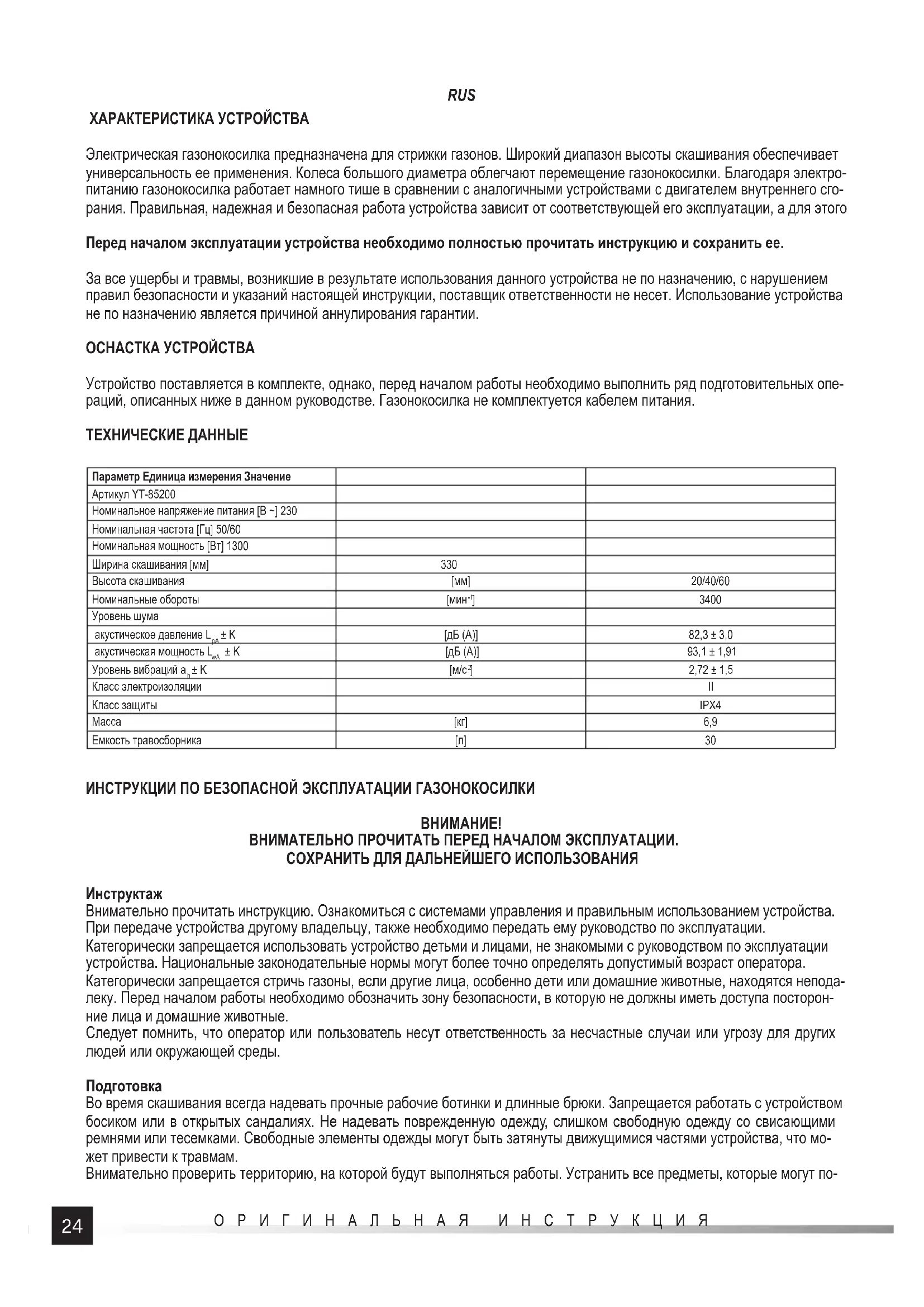 Hinweis! Vor der Lagerung oder dem Transport des Rasenmähers muss man ihn von der Stromversorgung trennen. Das Reinigen sollte gem. den Hinweisen der Anleitung erfolgen. Das Gerät ist in dunklen, trockenen, frostfreien und gut belüfteten Räumen zu lagern. Der Lagerort ist vor Kindern zu schützen. Die Lagertemperatur sollte zwischen 10 und 30 °C betragen. Es wird die Aufbewahrung des Rasenmähers in der fabrikmäßigen Verpackung oder in einer anderen staubgeschützten Verpackung empfohlen. Vor dem Transport des Rasenmähers muss man ihn auf die größte Schnitthöhe einstellen. Beim Transportieren ist er an den Griff en zu tragen. Der Rasenmäher ist während des Transports vor Schlägen und starken Vibrationen zu schützen. Außerdem muss man ihn für die Zeit des Transports vor dem Verrutschen und Umkippen entsprechend sichern.24 ОРИГИНАЛЬНАЯ ИНСТРУКЦИЯ RUS ХАРАКТЕРИСТИКА УСТРОЙСТВА Электрическая газонокосилка предназначена для стрижки газонов. Широкий диапазон высоты скашивания обеспечивает универсальность ее применения. Колеса большого диаметра облегчают перемещение газонокосилки. Благодаря электро- питанию газонокосилка работает намного тише в сравнении с аналогичными устройствами с двигателем внутреннего сго- рания. Правильная, надежная и безопасная работа устройства зависит от соответствующей его эксплуатации, а для этого Перед началом эксплуатации устройства необходимо полностью прочитать инструкцию и сохранить ее. За все ущербы и травмы, возникшие в результате использования данного устройства не по назначению, с нарушением правил безопасности и указаний настоящей инструкции, поставщик ответственности не несет. Использование устройства не по назначению является причиной аннулирования гарантии. ОСНАСТКА УСТРОЙСТВА Устройство поставляется в комплекте, однако, перед началом работы необходимо выполнить ряд подготовительных опе- раций, описанных ниже в данном руководстве. Газонокосилка не комплектуется кабелем питания. ТЕХНИЧЕСКИЕ ДАННЫЕ Параметр Единица измерения Значение Артикул YT-85200 Номинальное напряжение питания [В ~] 230 Номинальная частота [Гц] 50/60 Номинальная мощность [Вт] 1300 Ширина скашивания [мм] 330 Высота скашивания [мм] 20/40/60 Номинальные обороты [мин