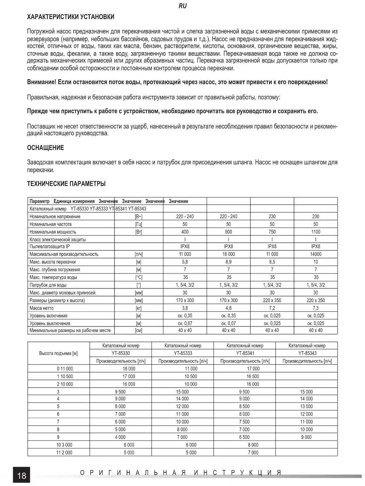 ТЕХНИЧЕСКИЕ ПАРАМЕТРЫ Параметр Единица измерения Значение Значение Значение Значение Каталожный номер YT-85330 YT-85333 YT-85341 YT-85343 Номинальное напряжение [В~] 220 - 240 220 - 240 230 230 Номинальная частота [Гц] 50505050 Номинальная мощность [Вт] 400 900 750 1100 Класс электрической защиты IIII Пылевлагозащита IP IPX8 IPX8 IPX8 IPX8 Максимальная производительность [л/ч] 11 000 18 000 11 000 14000 Макс. высота перекачки [м] 5,8 8,9 8,5 10 Макс. глубина погружения [м] 7777 Макс. температура воды [