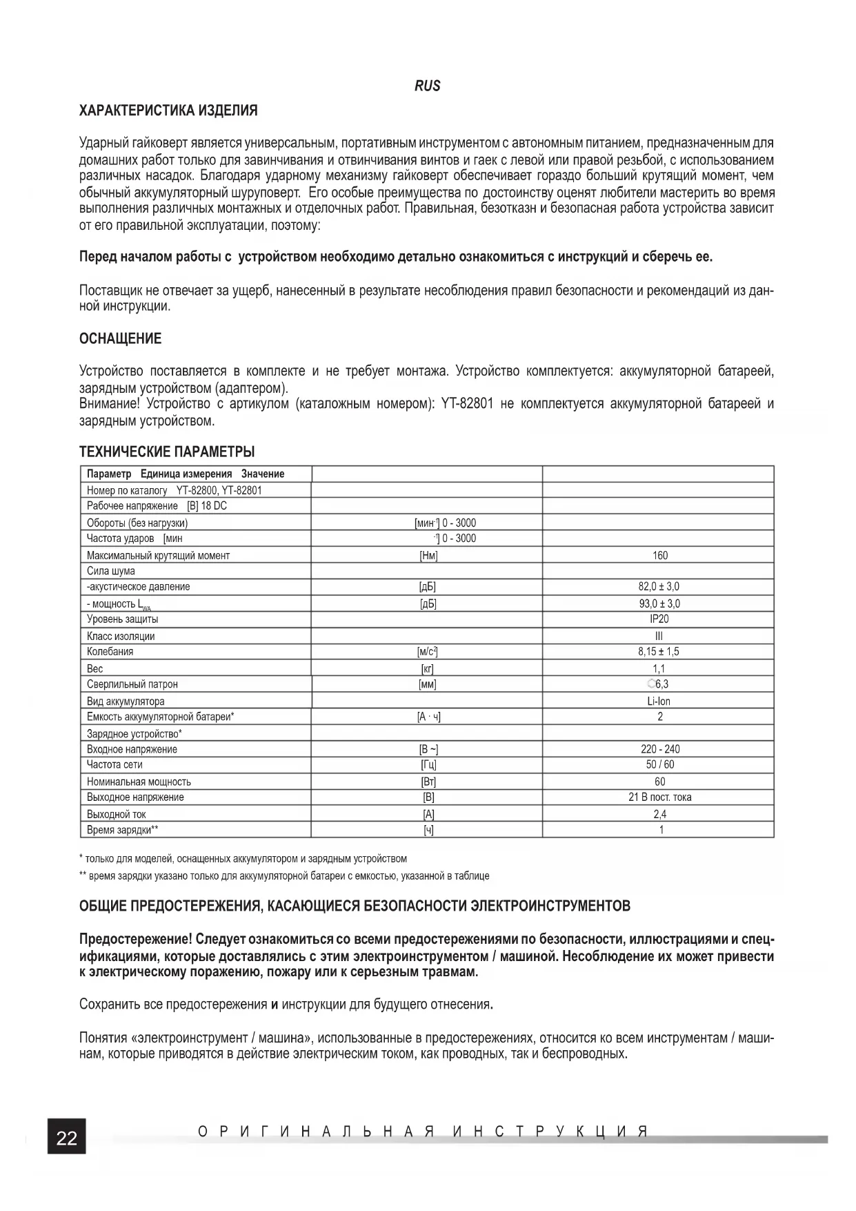 - только для моделей, оснащенных аккумулятором и зарядным устройством ** время зарядки указано только для аккумуляторной батареи с емкостью, указанной в таблице ОБЩИЕ ПРЕДОСТЕРЕЖЕНИЯ, КАСАЮЩИЕСЯ БЕЗОПАСНОСТИ ЭЛЕКТРОИНСТРУМЕНТОВ Предостережение! Следует ознакомиться со всеми предостережениями по безопасности, иллюстрациями и спец- ификациями, которые доставлялись с этим электроинструментом / машиной. Несоблюдение их может привести к электрическому поражению, пожару или к серьезным травмам. Сохранить все предостережения и инструкции для будущего отнесения. Понятия «электроинструмент / машина», использованные в предостережениях, относится ко всем инструментам / маши- нам, которые приводятся в действие электрическим током, как проводных, так и беспроводных.23 ОРИГИНАЛЬНАЯ ИНСТРУКЦИЯ RUS Безопасность рабочего места Рабочее место следует сохранять при хорошем освещении и в чистоте. Беспорядок и слабое освещение могут быть причинами возникновения случаев. Не следует работать электроинструментами / машинами в среде с увеличенным риском взрыва, который содер- жит горючие жидкости, газы или пары. Электроинструменты / машины генерируют искры, которые могут зажечь