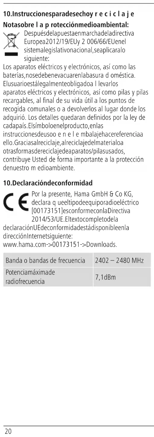 Настоящим компания Hama GmbH &Co KG заявляет, чторадиооборудование типа [00173151] отвечает требованиям директивы 2014/53/ЕС. Сполным текстом декларации осоответствии требованиям ЕС можно ознакомиться здесь: www.hama.com->00173151->Downloads. Диапазон/диапазоны частот 2402 –2480 MHz Максимальная излучаемая