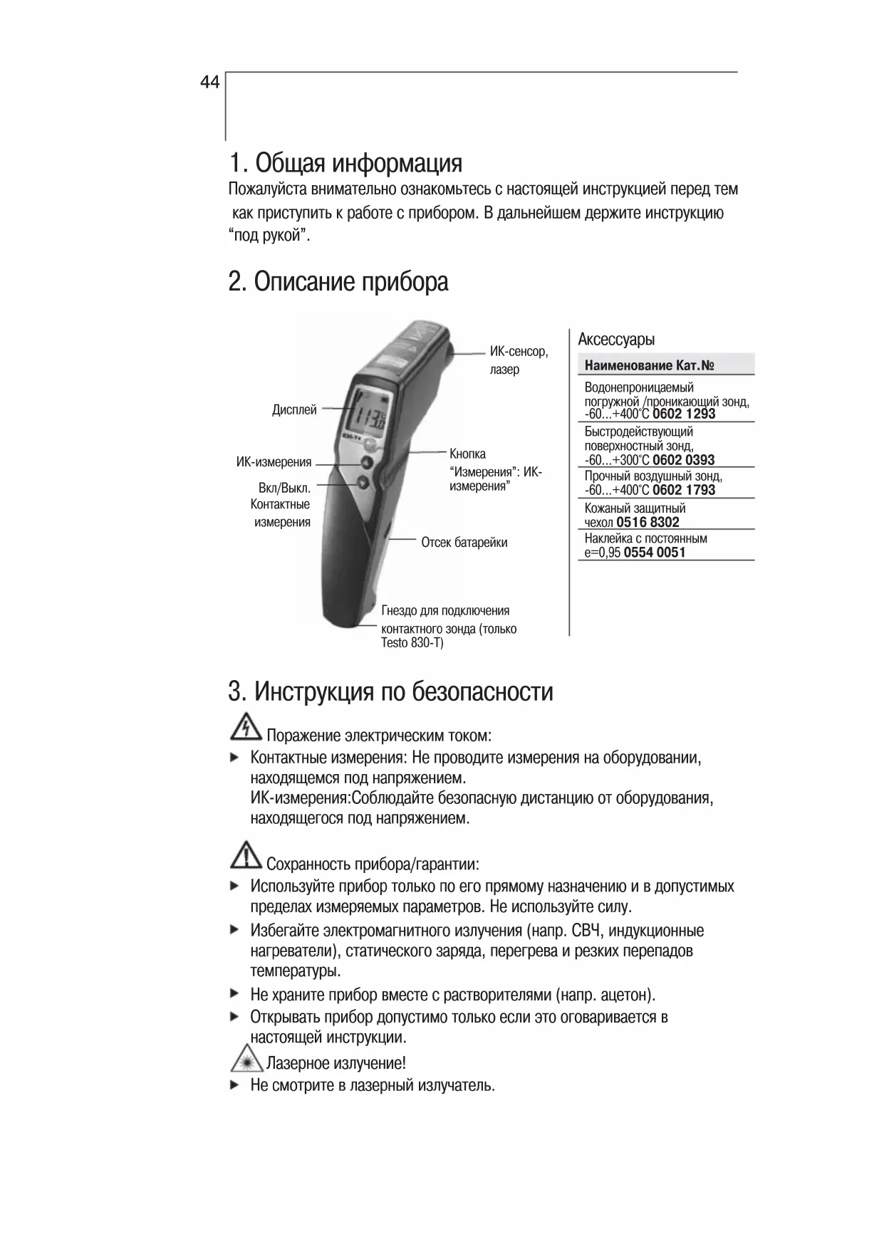 Поражение электрическим током: Контактные измерения: Не проводите измерения на оборудовании, находящемся под напряжением. ИКизмерения:Соблюдайте безопасную дистанцию от оборудования, находящегося под напряжением. Сохранность прибора/гарантии: Используйте прибор только по его прямому назначению и в допустимых пределах измеряемых параметров. Не используйте силу. Избегайте электромагнитного излучения (напр. СВЧ, индукционные нагреватели), статического заряда, перегрева и резких перепадов температуры. Не храните прибор вместе с растворителями (напр. ацетон). Открывать прибор допустимо только если это оговаривается в настоящей инструкции. Лазерное излучение! Не смотрите в лазерный излучатель.