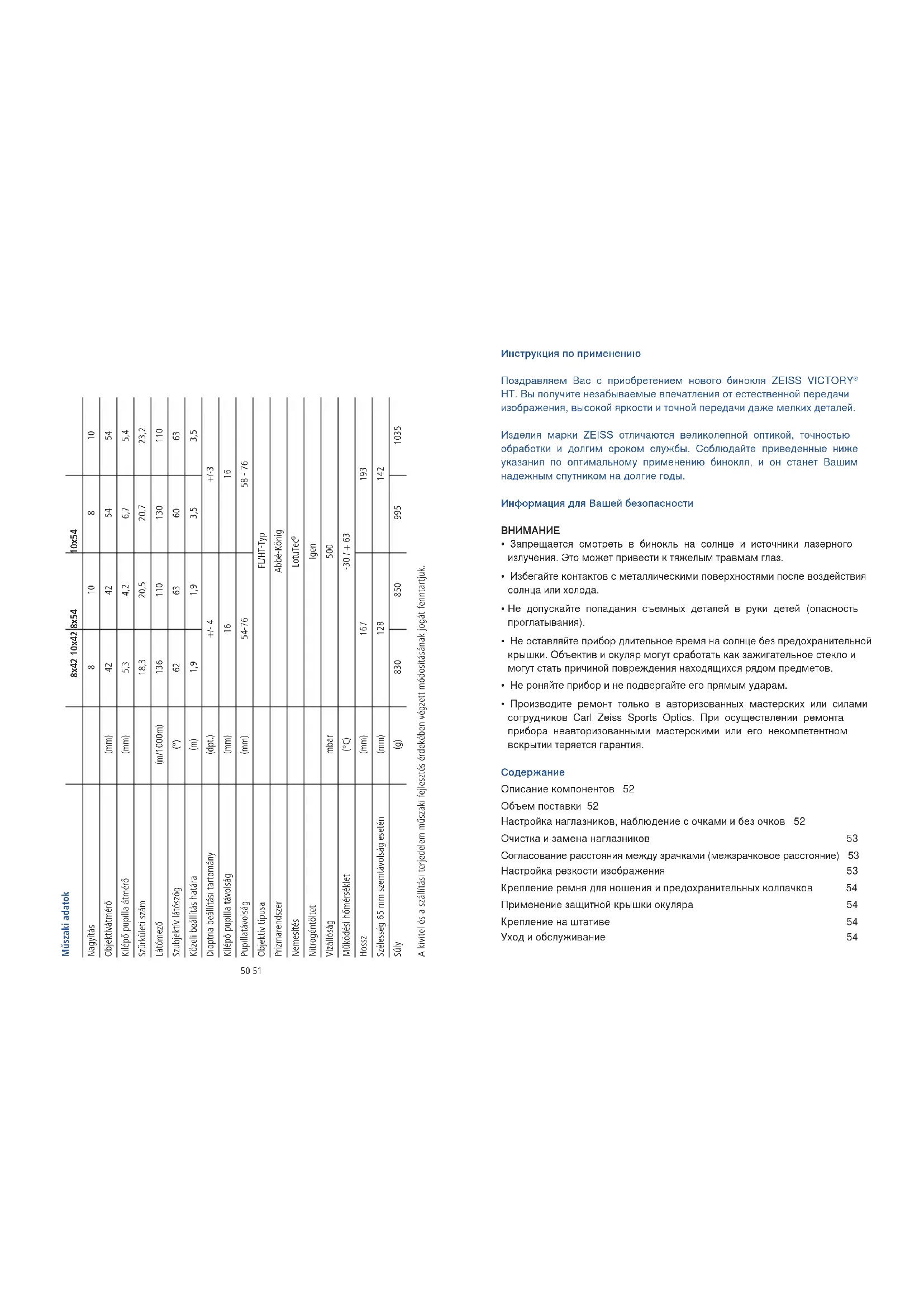 HT. Вы получите незабываемые впечатления от естественной передачи изображения, высокой яркости и точной передачи даже мелких деталей. Изделия марки ZEISS отличаются великолепной оптикой, точностью обработки и долгим сроком службы. Соблюдайте приведенные ниже указания по оптимальному применению бинокля, и он станет Вашим надежным спутником на долгие годы. Информация для Вашей безопасности