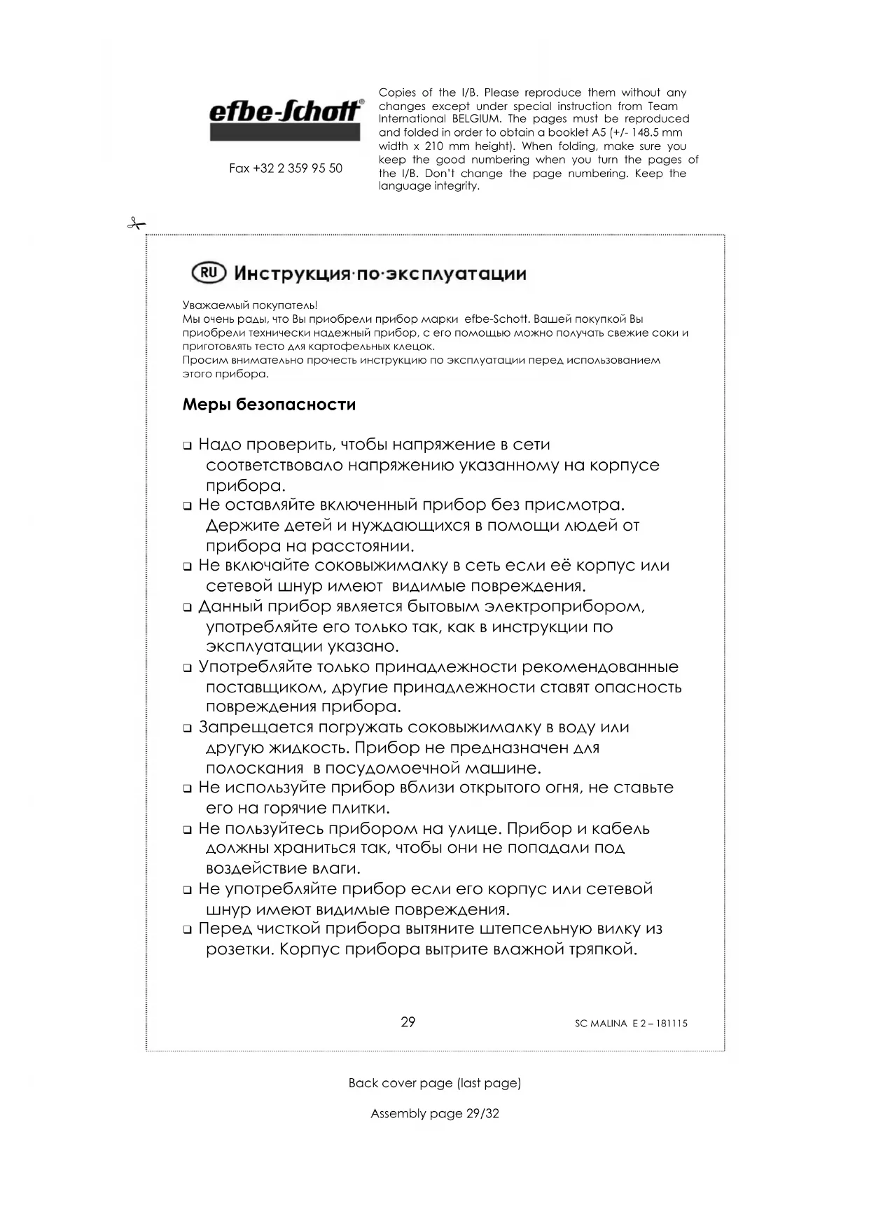 Не оставляйте включенный прибор без присмотра. Держите детей и нуждающихся в помощи людей от прибора на расстоянии. Не включайте соковыжималку в сеть если её корпус или сетевой шнур имеют видимые повреждения. Данный прибор является бытовым электроприбором, употребляйте его только так, как в инструкции по эксплуатации указано. Употребляйте только принадлежности рекомендованные поставщиком, другие принадлежности ставят опасность повреждения прибора. Запрещается погружать соковыжималку в воду или другую жидкость. Прибор не предназначен для полоскания в посудомоечной машине. Не используйте прибор вблизи открытого огня, не ставьте его на горячие плитки. Не пользуйтесь прибором на улице. Прибор и кабель должны храниться так, чтобы они не попадали под воздействие влаги. Не употребляйте прибор если его корпус или сетевой шнур имеют видимые повреждения. Перед чисткой прибора вытяните штепсельную вилку из розетки. Корпус прибора вытрите влажной тряпкой. Copies of the I/B. Please reproduce them without any changes except under special instruction from Team International BELGIUM. The pages must be reproduced and folded in order to obtain a booklet A5 (+/- 148.5 mm width x 210 mm height). When folding, make sure you keep the good numbering when you turn the pages of the I/B. Don’t change the page numbering. Keep the language integrity.