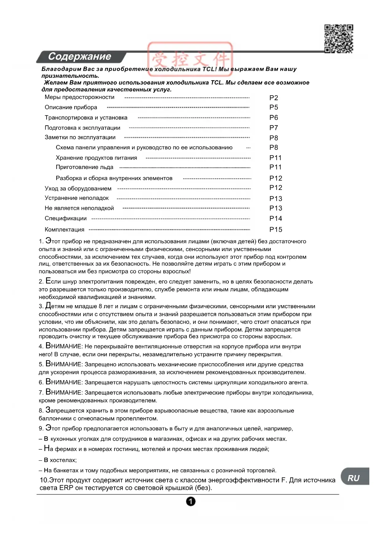 Благодарим Вас за приобретение холодильника TCL! Мы выражаем Вам нашу признательность.Желаем Вам приятного использования холодильника TCL. Мы сделаем все возможное для предоставления качественных услуг.Меры предосторожности Описание прибора Транспортировка и установка Подготовка к эксплуатации Заметки по эксплуатации Схема панели управления и руководство по ее использованию Хранение продуктов питания Приготовление льда Разборка и сборка внутренних элементов Уход за оборудованием Устранение неполадок Не является неполадкой Спецификации Комплектация