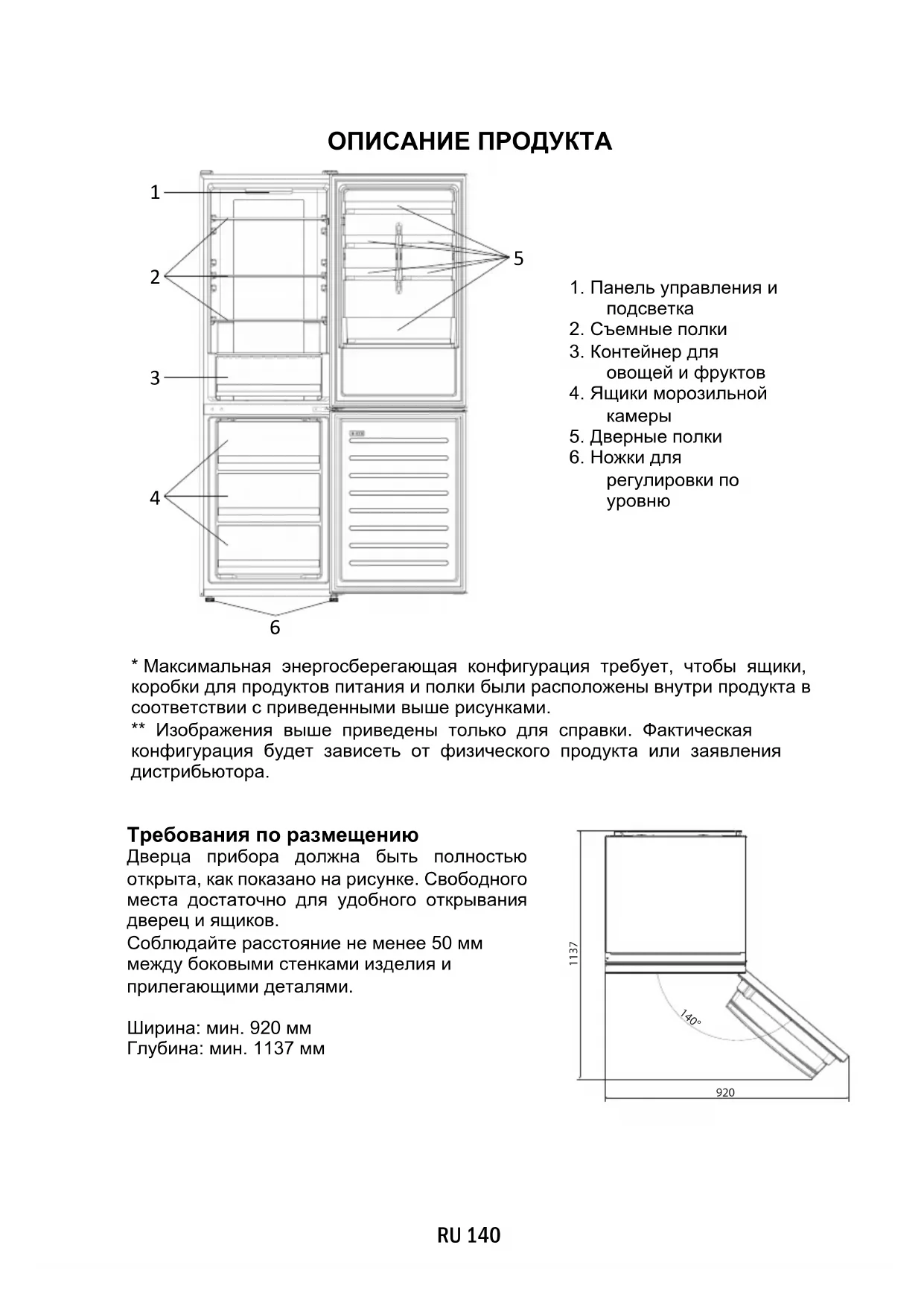 - Максимальная энергосберегающая конфигурация требует, чтобы ящики, коробки для продуктов питания и полки были расположены внутри продукта в соответствии с приведенными выше рисунками. ** Изображения выше приведены только для справки. Фактическая конфигурация будет зависеть от физического продукта или заявления дистрибьютора. Требования по размещению Дверца прибора должна быть полностью открыта, как показано на рисунке. Свободного места достаточно для удобного открывания дверец и ящиков. Соблюдайте расстояние не менее 50 мм между боковыми стенками изделия и прилегающими деталями. Ширина: мин. 920 мм Глубина: мин. 1137 мм