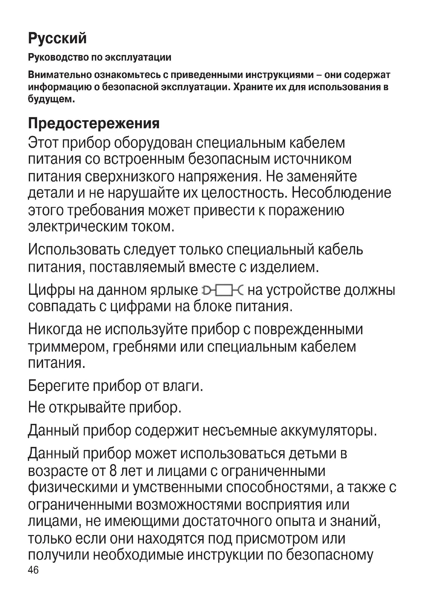 Предостережения Этот прибор оборудован специальным кабелем питания со встроенным безопасным источником питания сверхнизкого напряжения. Не заменяйте детали и не нарушайте их целостность. Несоблюдение этого требования может привести к поражению электрическим током. Использовать следует только специальный кабель питания, поставляемый вместе с изделием. Цифры на данном ярлыке на устройстве должны совпадать с цифрами на блоке питания. Никогда не используйте прибор с поврежденными триммером, гребнями или специальным кабелем