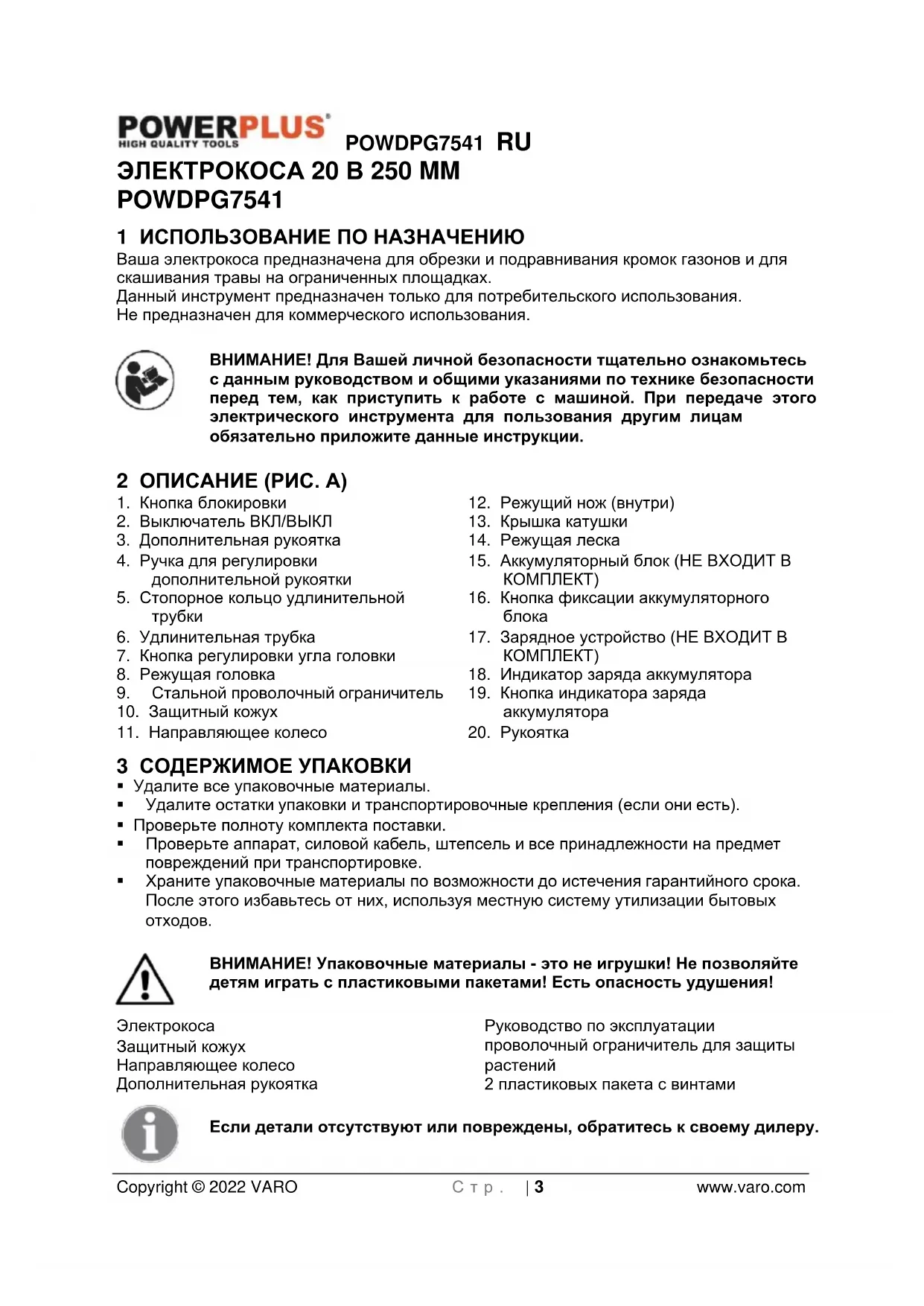 - 17 ДЕКЛАРАЦИЯ О СООТВЕТСТВИИ POWDPG7541 RU Copyright © 2022 VARO С т р . | 3 www.varo.com ЭЛЕКТРОКОСА 20 В 250 MM POWDPG7541 1 ИСПОЛЬЗОВАНИЕ ПО НАЗНАЧЕНИЮ Ваша электрокоса предназначена для обрезки и подравнивания кромок газонов и для скашивания травы на ограниченных площадках. Данный инструмент предназначен только для потребительского использования. Не предназначен для коммерческого использования. ВНИМАНИЕ! Для Вашей личной безопасности тщательно ознакомьтесь с данным руководством и общими указаниями по технике безопасности перед тем, как приступить к работе с машиной. При передаче этого электрического инструмента для пользования другим лицам обязательно приложите данные инструкции. 2 ОПИСАНИЕ (РИС. A) p. 14
