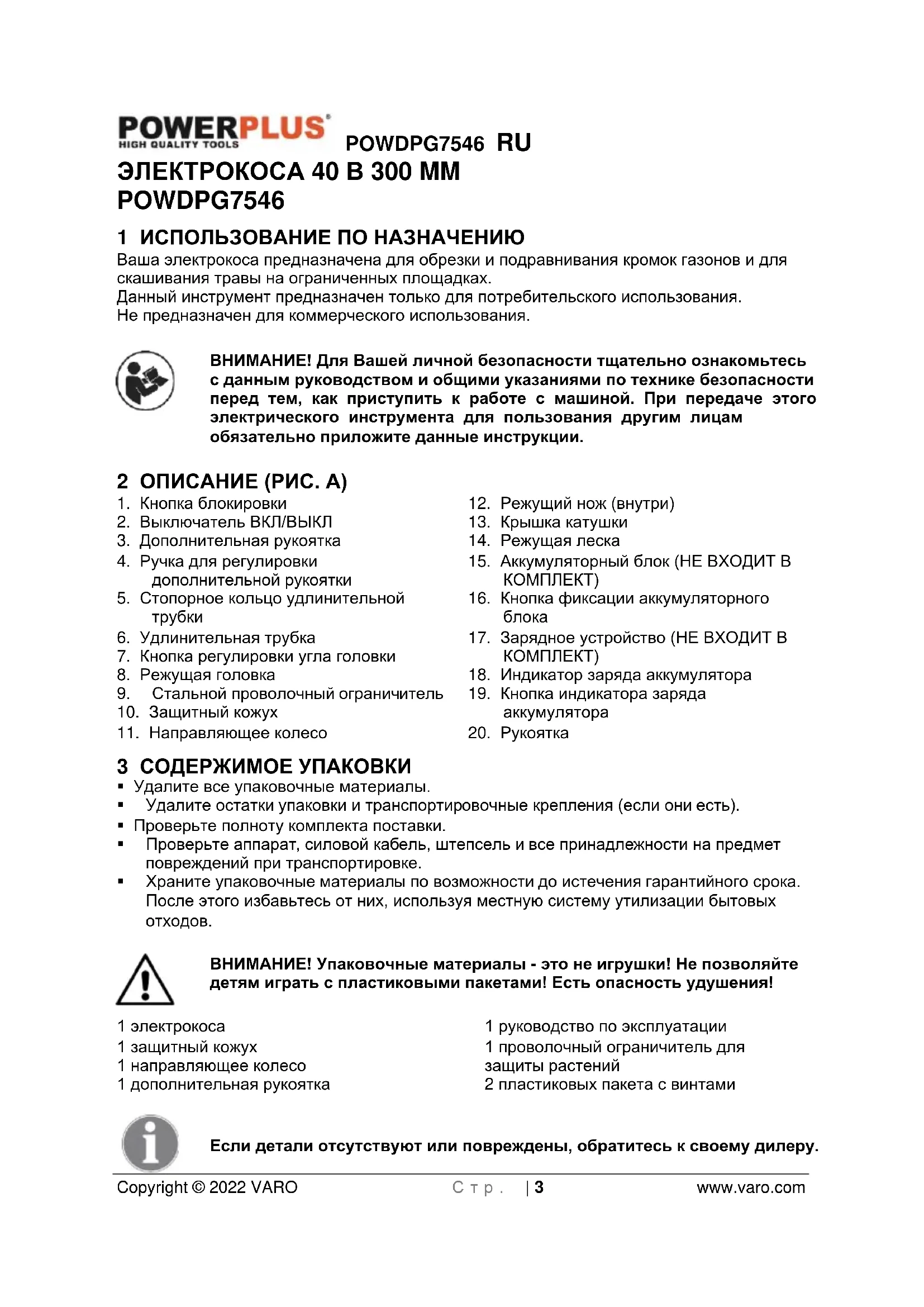 - 17 ДЕКЛАРАЦИЯ О СООТВЕТСТВИИ POWDPG7546 RU Copyright © 2022 VARO С т р . | 3 www.varo.com ЭЛЕКТРОКОСА 40 В 300 MM POWDPG7546 1 ИСПОЛЬЗОВАНИЕ ПО НАЗНАЧЕНИЮ Ваша электрокоса предназначена для обрезки и подравнивания кромок газонов и для скашивания травы на ограниченных площадках. Данный инструмент предназначен только для потребительского использования. Не предназначен для коммерческого использования. ВНИМАНИЕ! Для Вашей личной безопасности тщательно ознакомьтесь с данным руководством и общими указаниями по технике безопасности перед тем, как приступить к работе с машиной. При передаче этого электрического инструмента для пользования другим лицам обязательно приложите данные инструкции. 2 ОПИСАНИЕ (РИС. A) p. 14