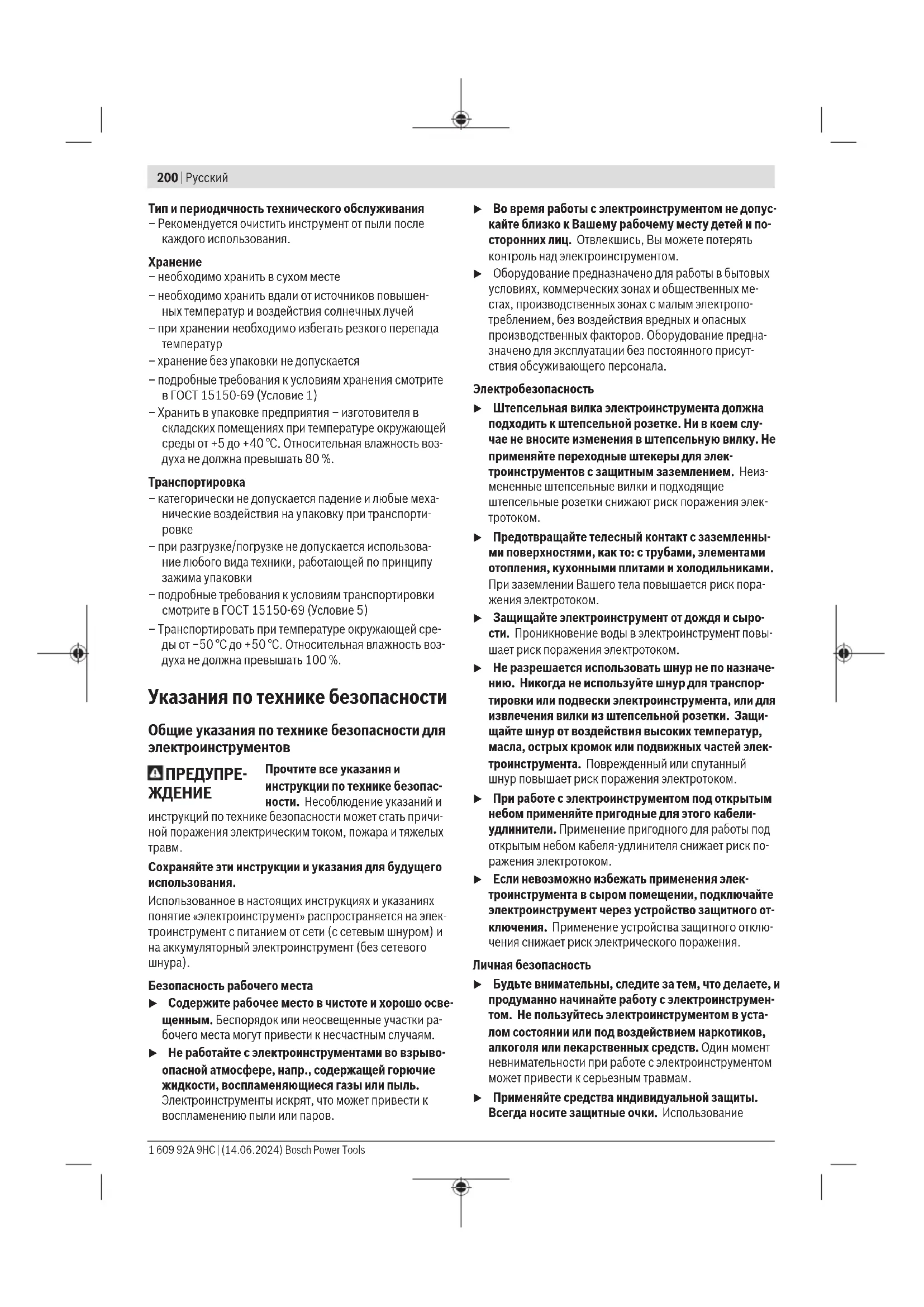 – не включать при попадании воды в корпус Критерии предельных состояний – перетёрт или повреждён электрический кабель – поврежден корпус изделия Bosch Power Tools 1 609 92A 9HC | (14.06.2024)200 | Русский Тип и периодичность технического обслуживания – Рекомендуется очистить инструмент от пыли после каждого использования.