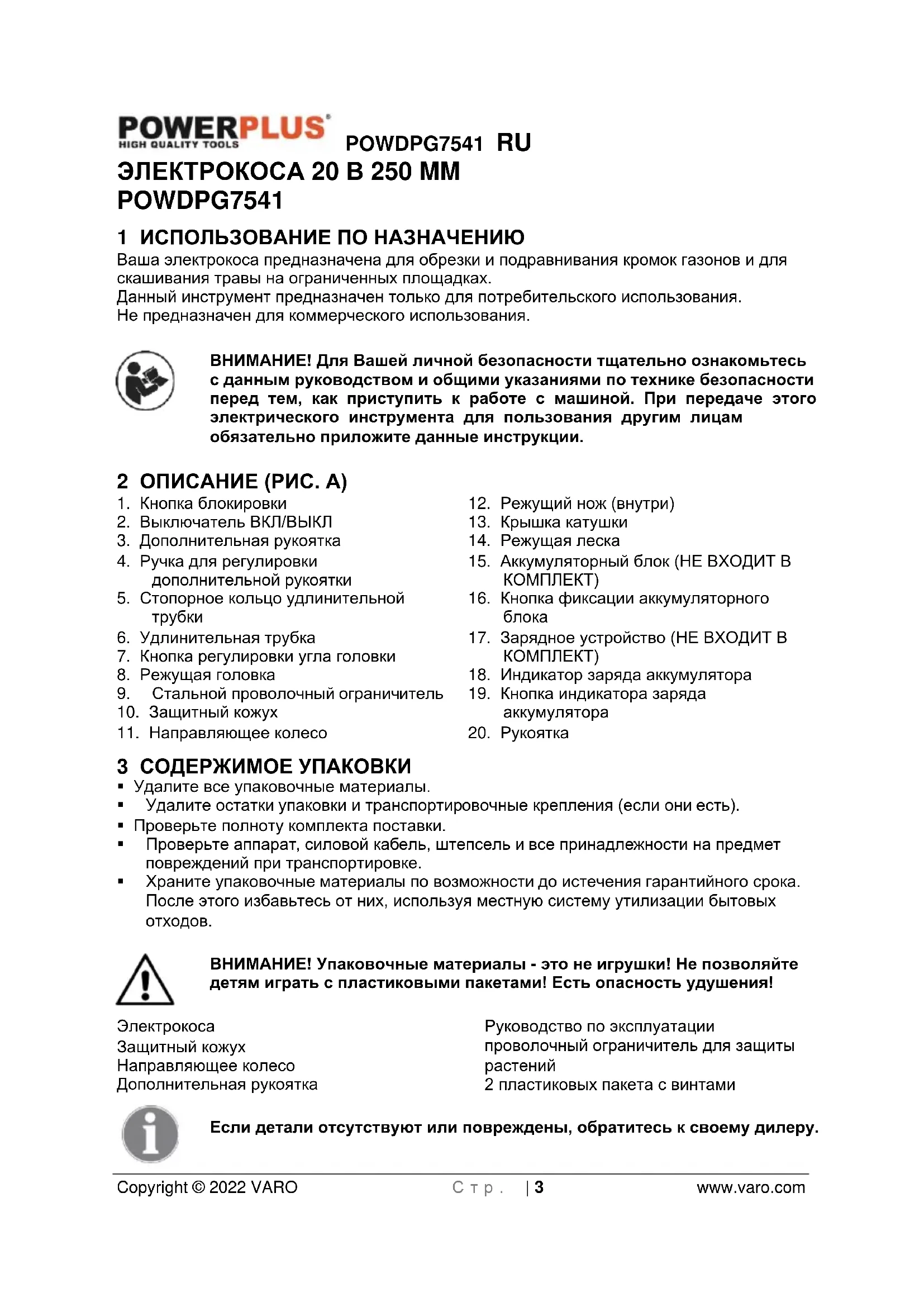 - 17 ДЕКЛАРАЦИЯ О СООТВЕТСТВИИ POWDPG7541 RU Copyright © 2022 VARO С т р . | 3 www.varo.com ЭЛЕКТРОКОСА 20 В 250 MM POWDPG7541 1 ИСПОЛЬЗОВАНИЕ ПО НАЗНАЧЕНИЮ Ваша электрокоса предназначена для обрезки и подравнивания кромок газонов и для скашивания травы на ограниченных площадках. Данный инструмент предназначен только для потребительского использования. Не предназначен для коммерческого использования. ВНИМАНИЕ! Для Вашей личной безопасности тщательно ознакомьтесь с данным руководством и общими указаниями по технике безопасности перед тем, как приступить к работе с машиной. При передаче этого электрического инструмента для пользования другим лицам обязательно приложите данные инструкции. 2 ОПИСАНИЕ (РИС. A) p. 14