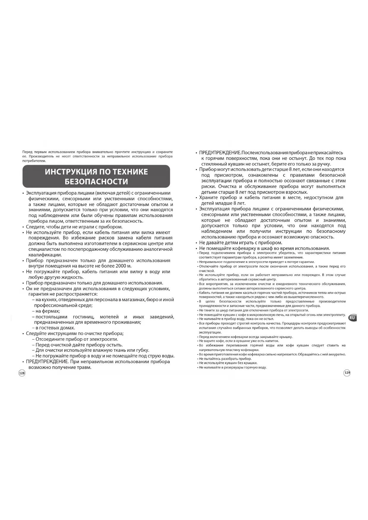 Перед первым использованием прибора внимательно прочтите инструкцию и сохраните ее. Производитель не несет ответственности за неправильное использование прибора потребителем. ИНСТРУКЦИЯ ПО ТЕХНИКЕ БЕЗОПАСНОСТИ