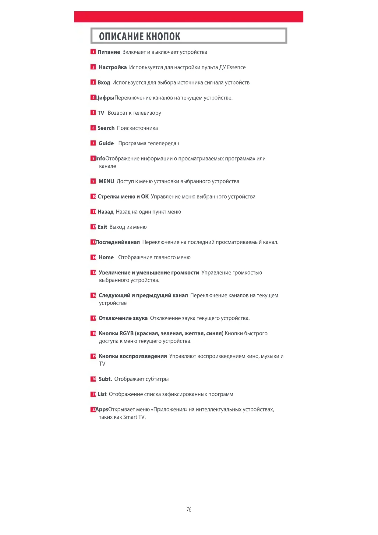 Кнопки RGYB (красная, зеленая, желтая, синяя) Кнопки быстрого доступа к меню текущего устройства.