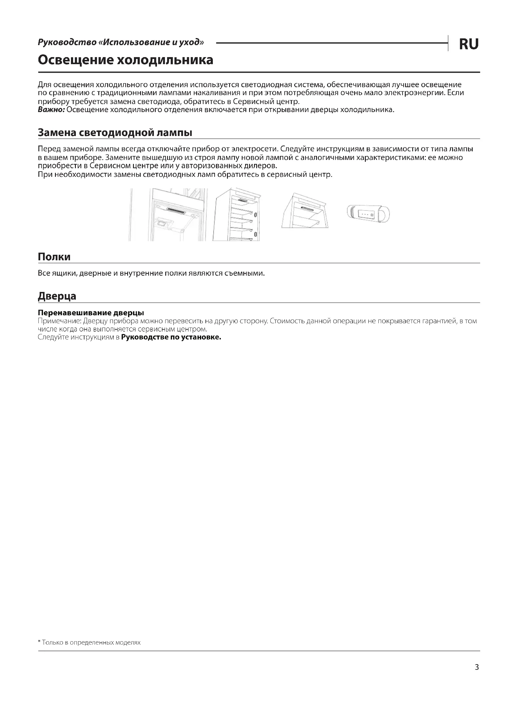 Руководство «Использование и уход» Освещение холодильника Для освещения холодильного отделения используется светодиодная система, обеспечивающая лучшее освещение по сравнению с традиционными лампами накаливания и при этом потребляющая очень мало электроэнергии. Если прибору требуется замена светодиода, обратитесь в Сервисный центр. Важно: Освещение холодильного отделения включается при открывании дверцы холодильника. Замена светодиодной лампы Перед заменой лампы всегда отключайте прибор от электросети. Следуйте инструкциям в зависимости от типа лампы в вашем приборе. Замените вышедшую из строя лампу новой лампой с аналогичными характеристиками: ее можно приобрести в Сервисном центре или у авторизованных дилеров. При необходимости замены светодиодных ламп обратитесь в сервисный центр.
