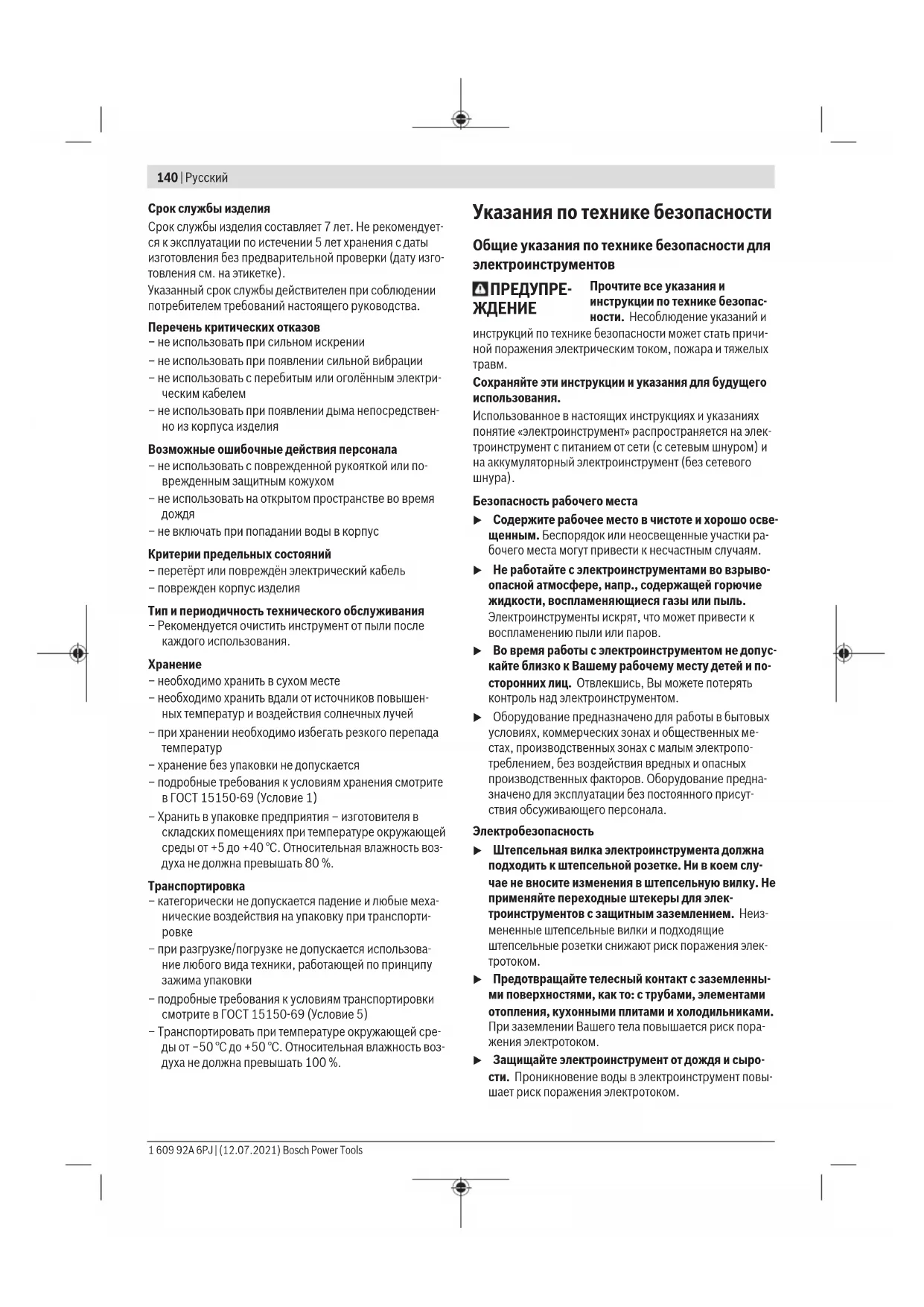 Toлько для стран Евразийского экономического союза (Таможенного союза) В состав эксплуатационных документов, предусмотрен- ных изготовителем для продукции, могут входить настоя- щее руководство по эксплуатации, а также приложения. Информация о подтверждении соответствия содержится в приложении. Информация о стране происхождения указана на корпу- се изделия и в приложении. Дата изготовления указана на последней странице об- ложки Руководства. Контактная информация относительно импортера содер- жится на упаковке. Bosch Power Tools 1 609 92A 6PJ | (12.07.2021)140 | Русский Срок службы изделия Срок службы изделия составляет 7 лет. Не рекомендует- ся к эксплуатации по истечении 5 лет хранения с даты изготовления без предварительной проверки (дату изго- товления см. на этикетке). Указанный срок службы действителен при соблюдении потребителем требований настоящего руководства. Перечень критических отказов – не использовать при сильном искрении – не использовать при появлении сильной вибрации – не использовать с перебитым или оголённым электри- ческим кабелем – не использовать при появлении дыма непосредствен- но из корпуса изделия Возможные ошибочные действия персонала – не использовать с поврежденной рукояткой или по- врежденным защитным кожухом – не использовать на открытом пространстве во время