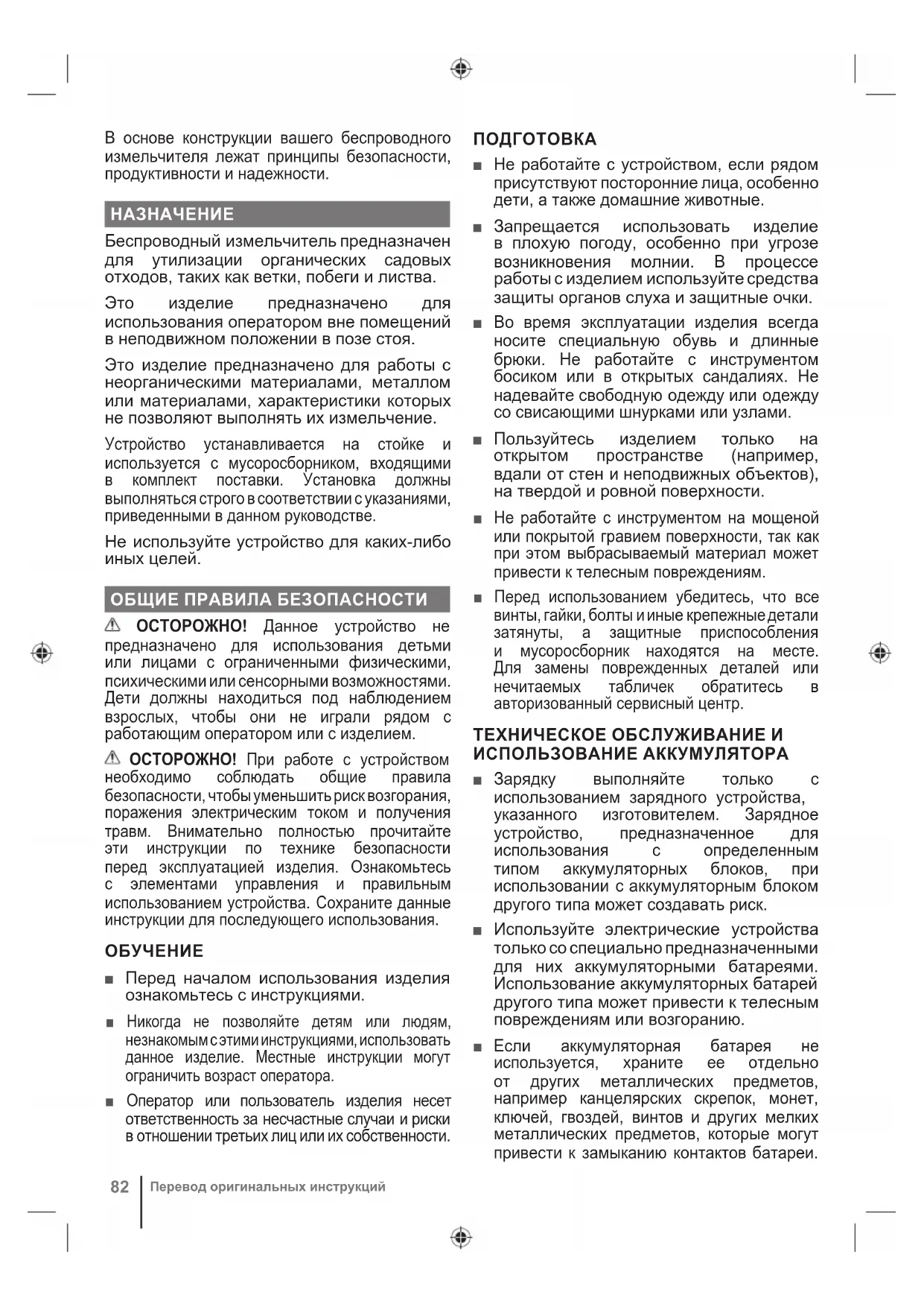 Перевод оригинальных инструкцийЗамыкание контактов батареи может вызвать ожоги или привести к возгоранию. ■ При ненормальных условиях из батареи может вытечь жидкость, избегайте контакта с ней. Если этого избежать не удалось, смойте жидкость водой. Если жидкость попала в глаза, после их промывания обратитесь за медицинской помощью. Жидкость, вытекшая из батареи, может вызвать раздражение или ожог. ■ Не используйте поврежденный или модифицированный аккумуляторный блок и инструмент. Поврежденные или модифицированные аккумуляторы могут вести себя непредсказуемо, что может привести к пожару, взрыву или послужить причиной травмы. ■ Запрещается подвергать аккумуляторный блок или инструмент воздействию огня и высокой температуры. Воздействие огня или температуры выше 130°C может привести к взрыву. ■ Заряжайте аккумуляторные блоки и инструмент в соответствии с инструкцией, не подвергая их при этом воздействию температур вне диапазона, указанного в инструкции. Несоблюдение инструкций и зарядка при воздействии температур вне диапазона, указанного в инструкции, может привести к повреждению аккумулятора и повысить риск возгорания. ОБСЛУЖИВАНИЕ ■ Техническое обслуживание и ремонт инструмента должно выполняться только квалифицированным специалистом с использованием взаимозаменяемых запасных частей. Это обеспечит нормальное техническое состояние устройства. ■ Обслуживание аккумуляторных блоков с признаками повреждения не допускается. Обслуживание аккумуляторных блоков должно выполняться производителем или авторизованным сервисным центром. ПРАВИЛА ТЕХНИКИ БЕЗОПАСНОСТИ ПРИ РАБОТЕ С БЕСПРОВОДНЫМ ИЗМЕЛЬЧИТЕЛЕМ ■ При установке изделия проверьте надежность его крепления, исключив возможность опрокидывания. При слишком частом отключении изделия остатки материала могут застревать в режущем блоке и останавливать двигатель при повторном включении. ■ Перед запуском изделия загляните в загрузочный отсек и убедитесь, что он пуст. ■ Держите лицо и тело в стороне от входного отверстия. ■ Не допускайте попадания рук и других частей тела или одежды в загрузочную камеру, выпускной лоток или в зону других движущихся частей. ■ Сохраняйте устойчивость во время работы. Старайтесь сохранять устойчивость и подыскивайте твердую опору. Не перенапрягать. Во время загрузки материала запрещается находиться выше уровня основания изделия. Передвигайтесь шагом, не бегайте. ■ При работе с изделием держитесь вдали от зоны разгрузки. ■ В процессе загрузки материала соблюдайте максимальную осторожность, чтобы не допустить попадания в него металла, камней, банок, бутылок и других посторонних предметов. ■ В случае попадания в режущий механизм посторонних предметов, возникновения необычного шума или вибрации выключите изделие и дождитесь полной остановки лезвий. Снимите аккумуляторную батарею. Выполните следующие шаги: ● Внимательно осмотрите изделие на предмет повреждений. ● Проверьте и затяните все незакрепленные детали изделия. ● замените или отремонтируйте поврежденные детали ■ Не допускайте накопления обрабатываемого материала в разгрузочном желобе, так как это может помешать надлежащему сбросу или вызвать засорение и привести к попаданию материала в устройство через всасывающее отверстие. ■ При блокировке изделия в